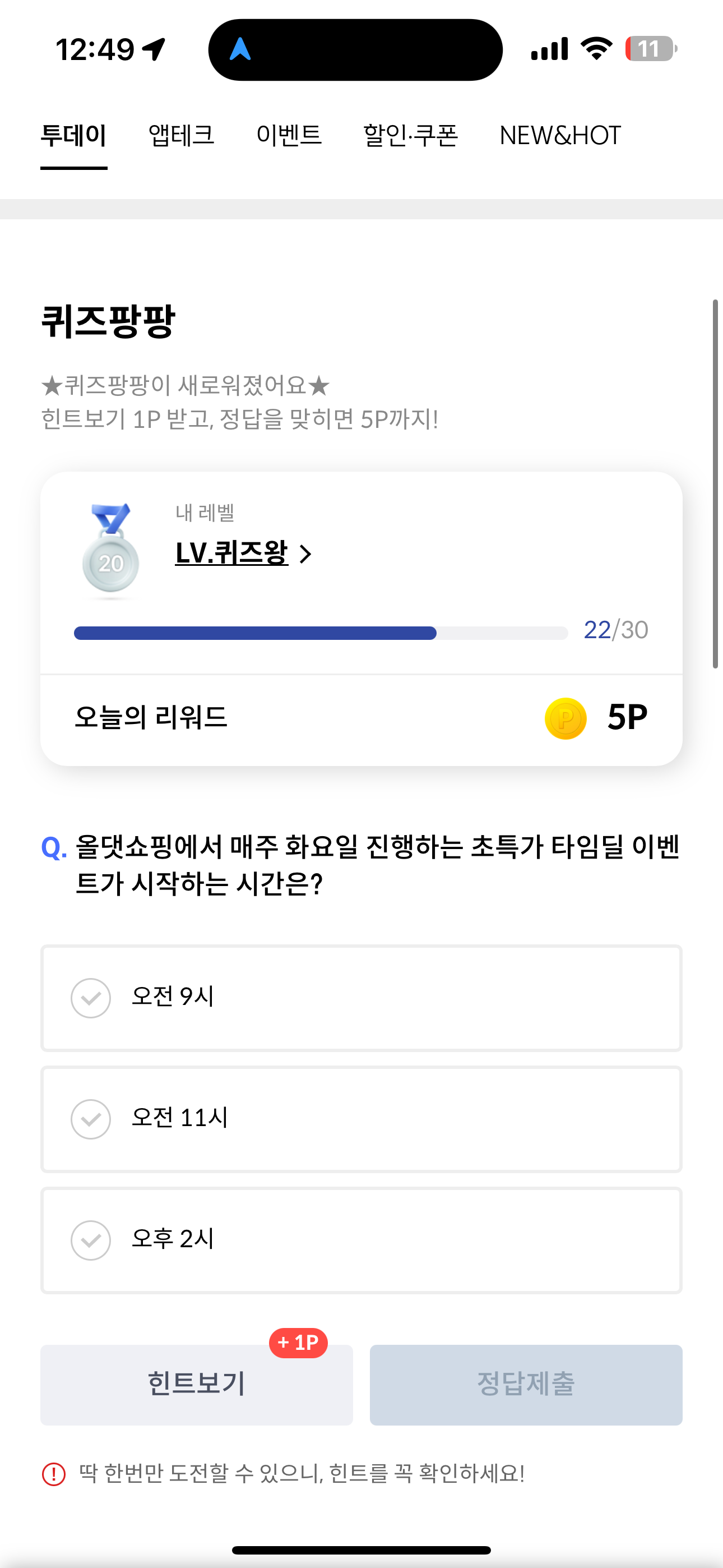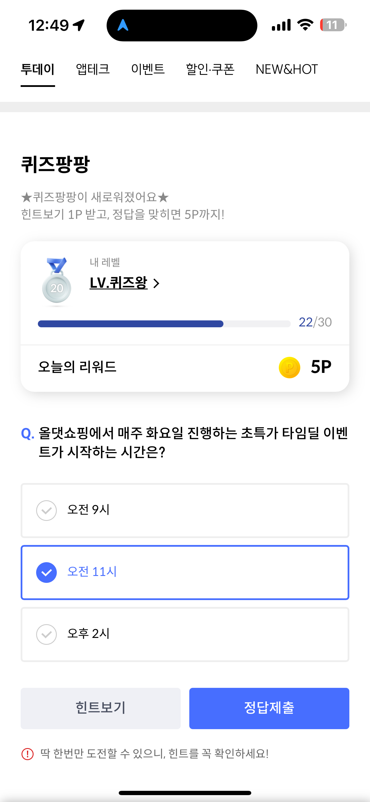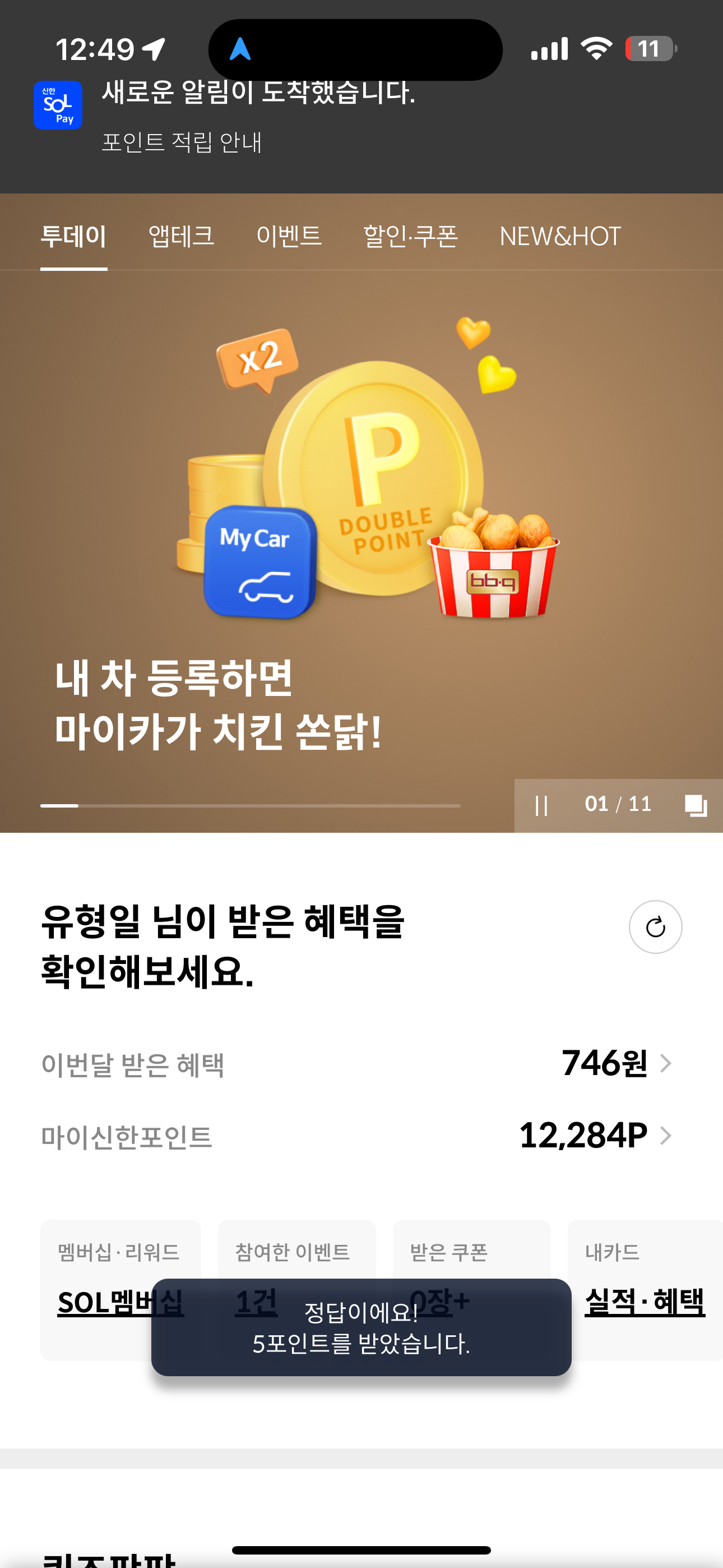신한카드 퀴즈팡팡 정답은 오전 11시 입니다