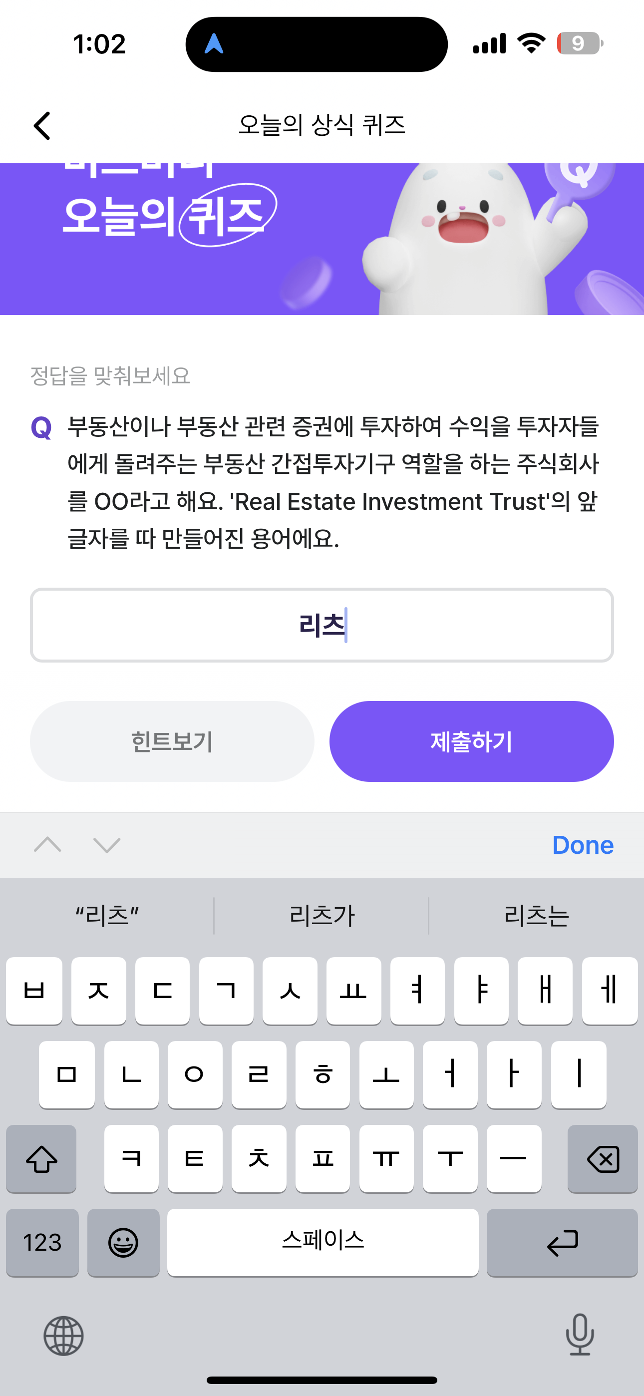 부동산이나 부동산 관련 증권에 투자하여 수익을 투자자들에게 돌려주는 부동산 간접투자기구 역할을 하는 주식회사를 OO라고 해요. 'Real Estate Investment Trust'의 앞글자를 따 만들어진 용어에요. 주관식 퀴즈인데요. 부동산 관련 투자를 하는 분이라면 꼭 알아두셔야 합니다.