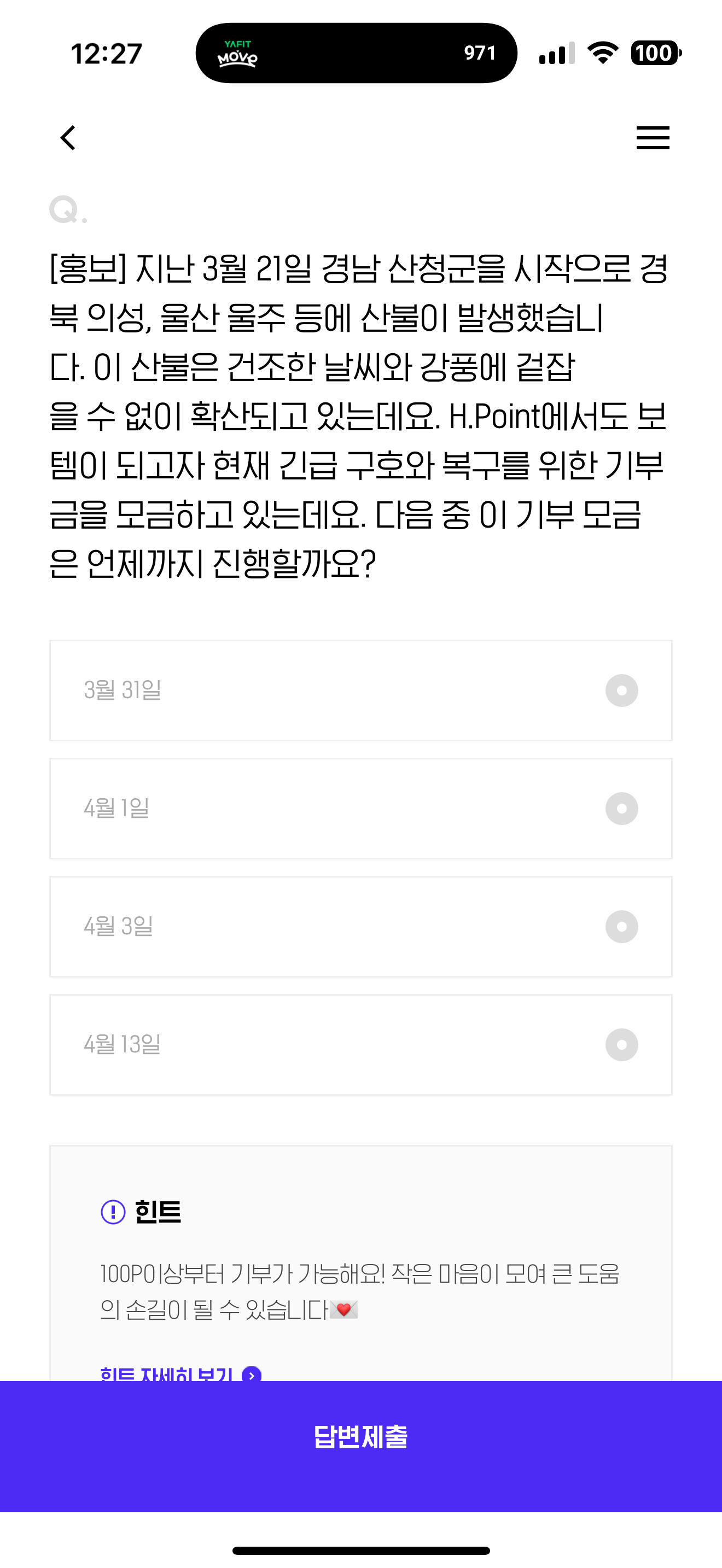 지난 3월 21일 경남 산청군을 시작으로 경북 의성, 울산 울주 등에 산불이 발생했습니다. 이 산불은 건조한 날시와 강품에 겉잡을 수 없이 확산되고 있는데요. H.Point에서도 보템이 되고자 현재 긴급 구호와 복구를 위한 기부금을 모금하고 있는데요. 다음 중 이 기부 모금은 언제까지 진행할까요? 보기는 1. 3월 31일 2. 4월 1일 3. 4월 3일 4. 4월 13일 입니다