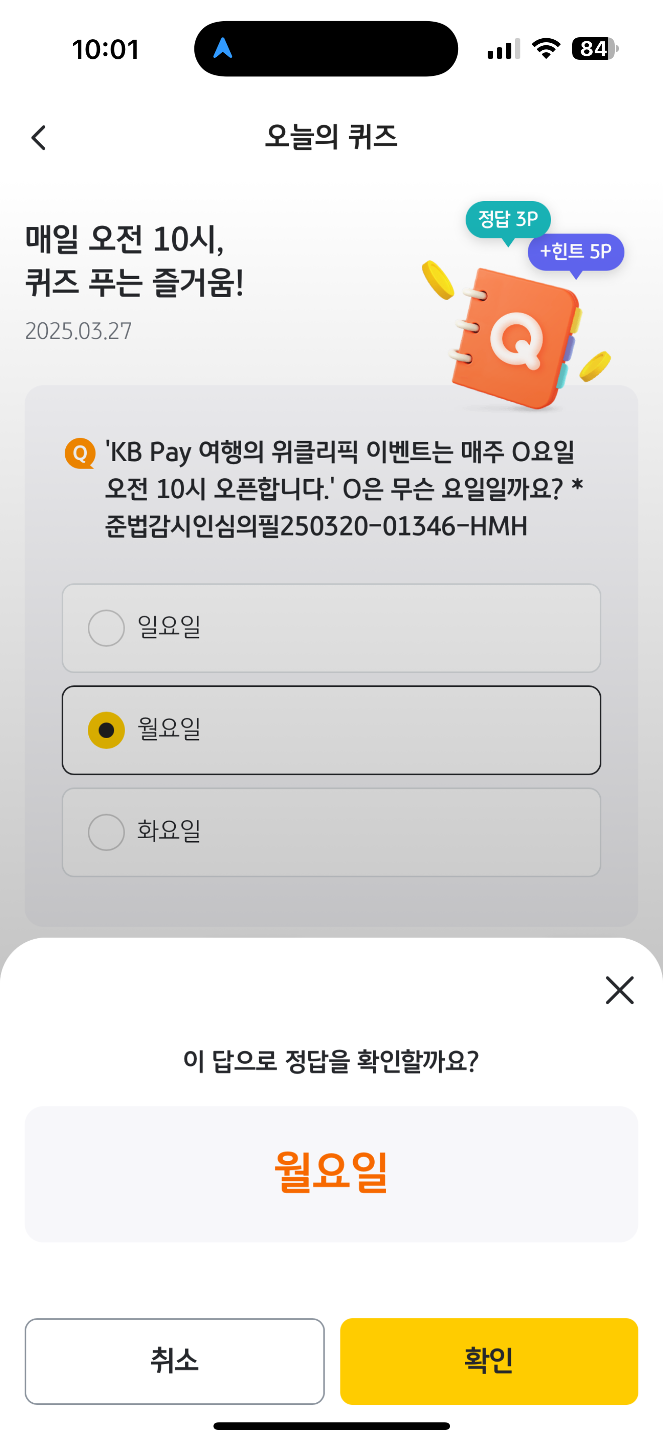 KB Pay 오늘의 퀴즈 정답은 월요일 입니다