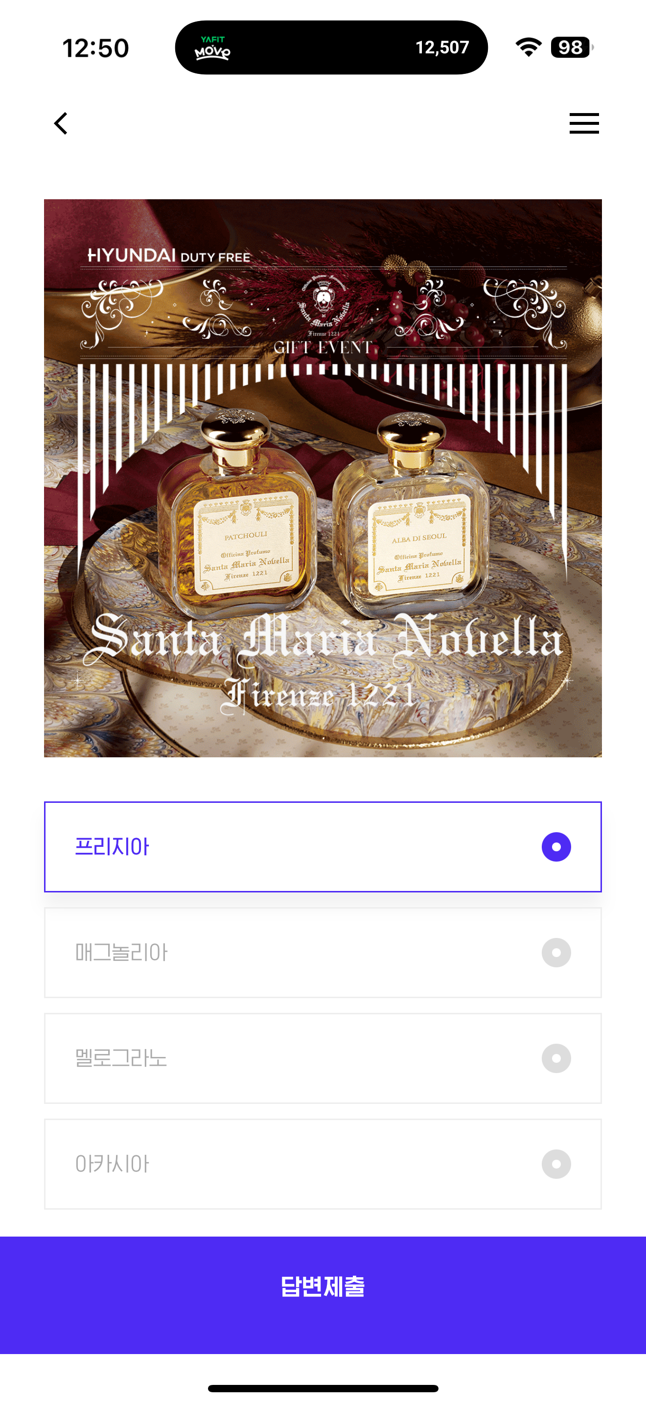 H포인트 퀴즈 3월 28일 정답(면세 찬스로 산타마리아노벨라 구매 예정이신 고객님 $170 이상 구매하시면 OOOO미니캔들과 바디로션을 증정해드려요~ 다음 중 OOO에 들어갈 향은 무엇일까요?)