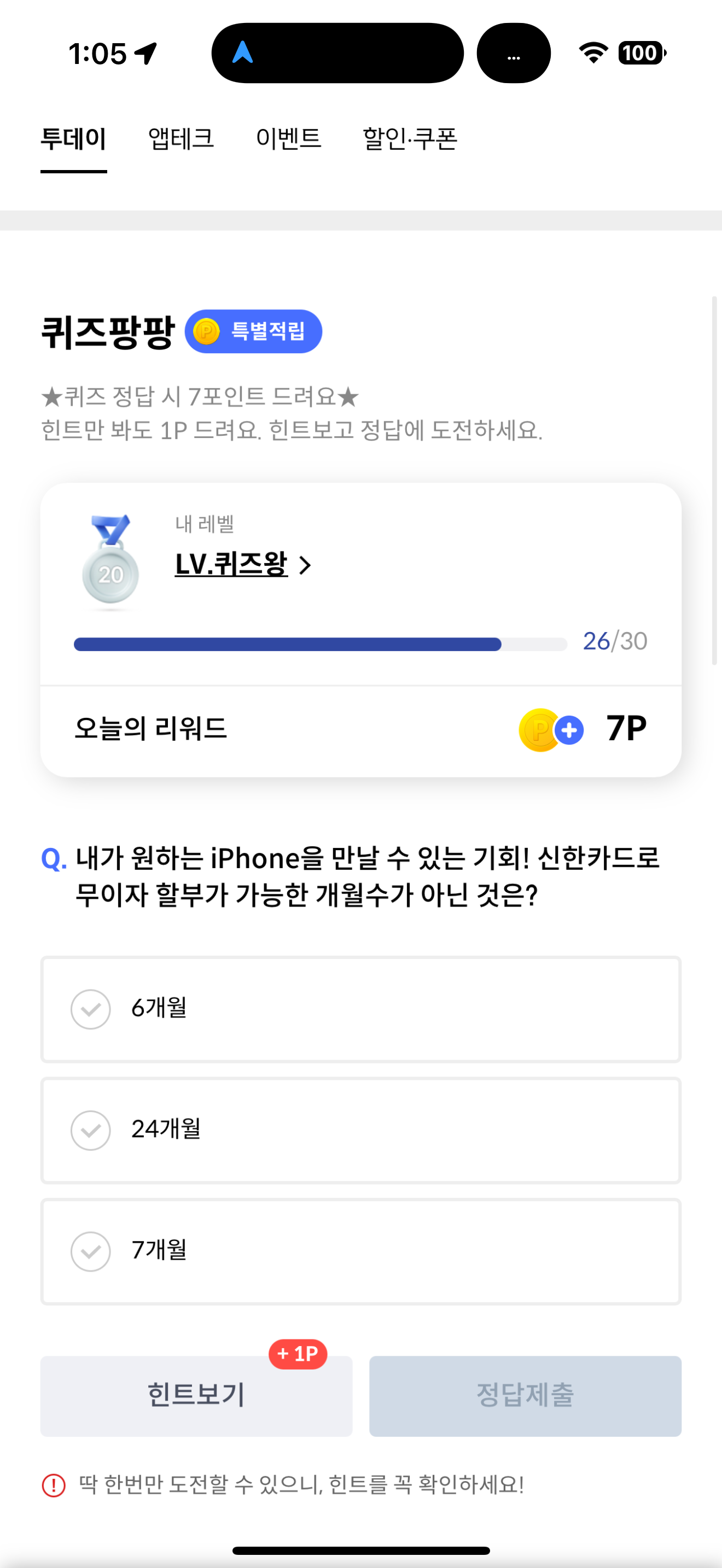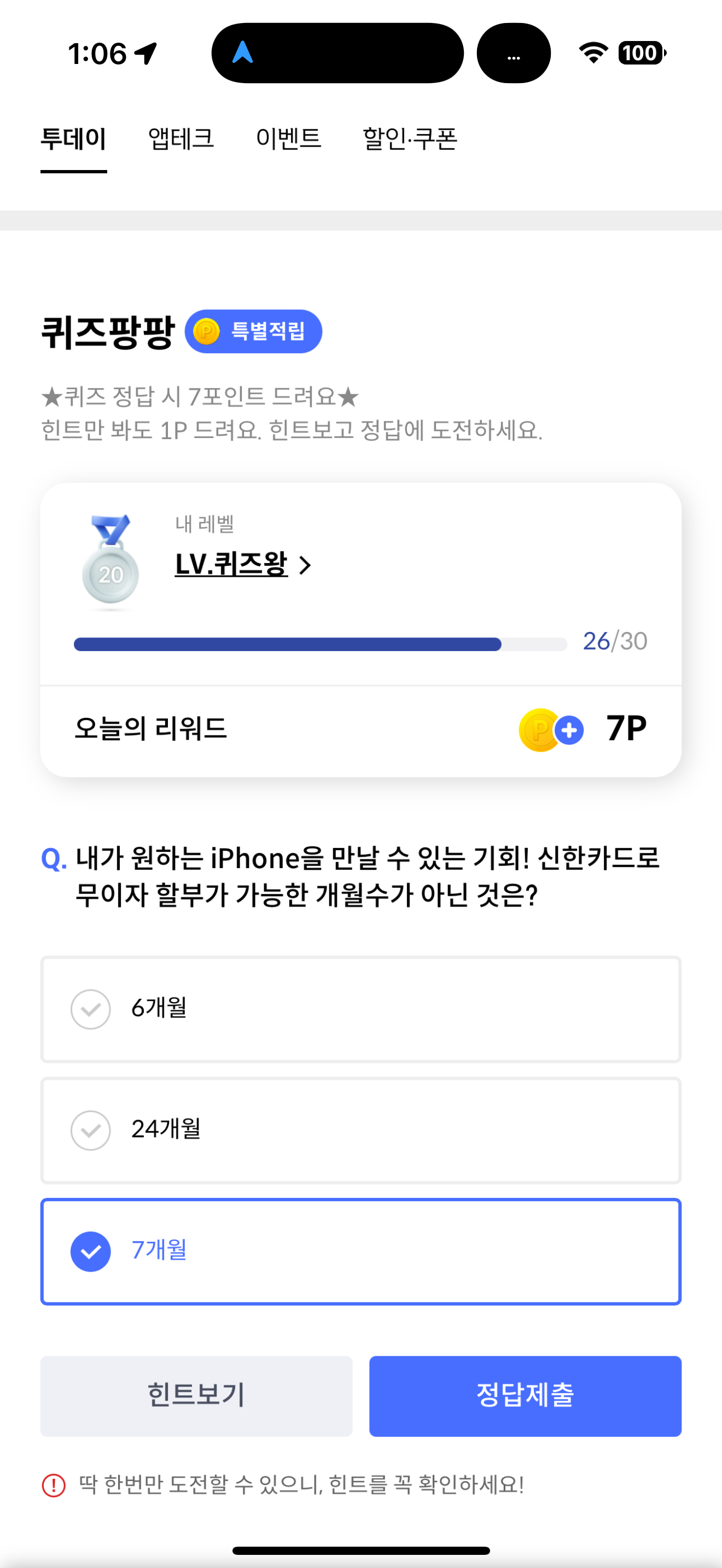 신한카드 퀴즈팡팡 정답은 7개월 입니다