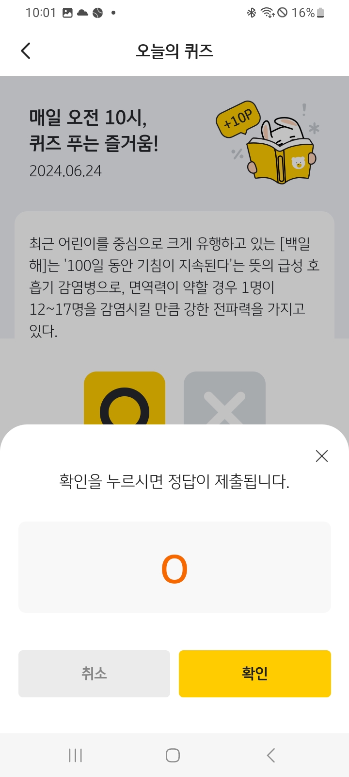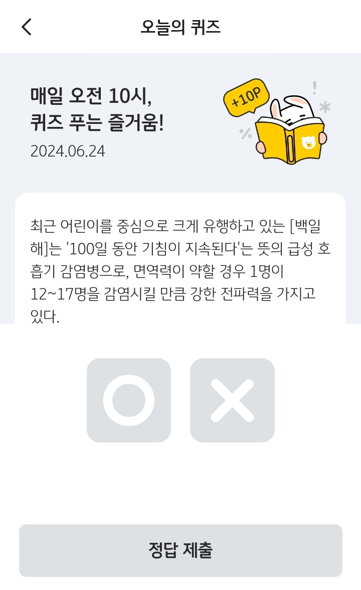 최근 어린이를 중심으로 크게 유행하고 있는 [백일해]는 '100일 동안 기침이 지속된다'는 뜻의 급성 호흡기 감염병으로, 면연력이 약할 경우 1명이 12~17명을 감염시킬 만큼 강한 전파력을 가지고 있다. O, X 퀴즈인데요. 최근 백일해가 유행처럼 번지고 있습니다. 아이들에게 치명적이니 병이니 주의가 필요합니다.