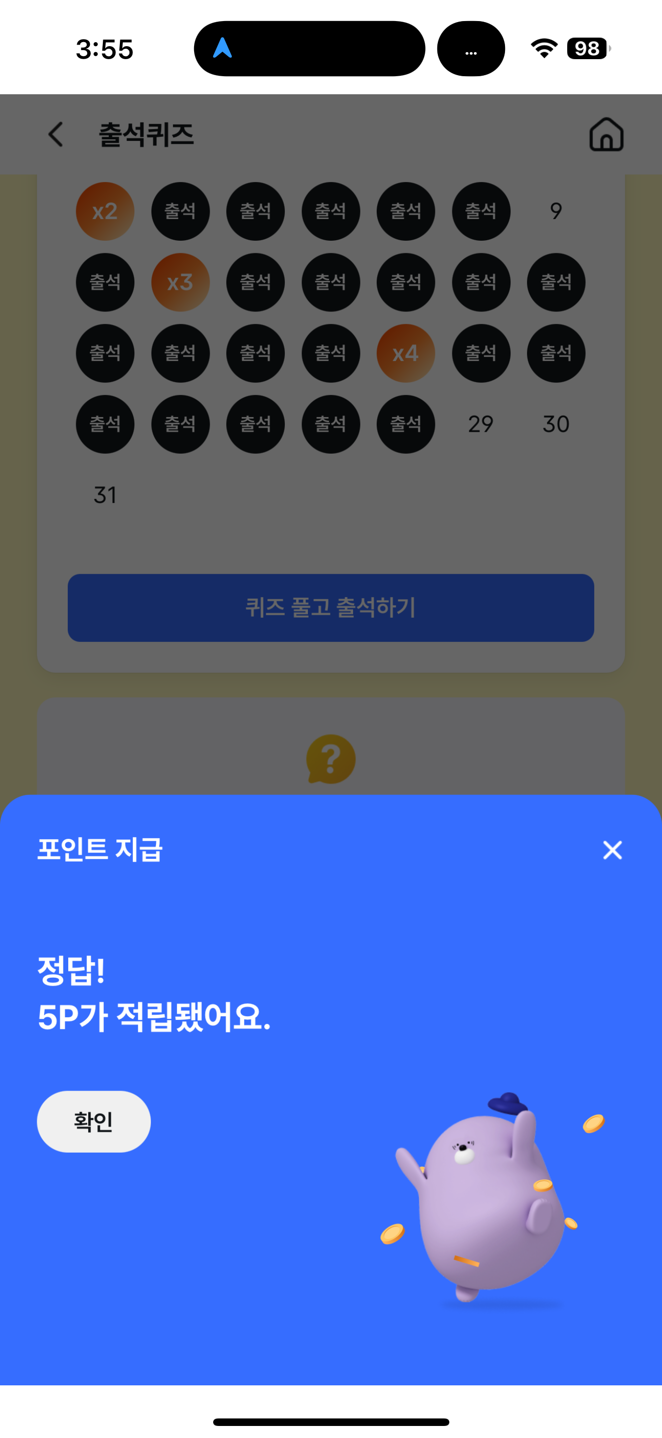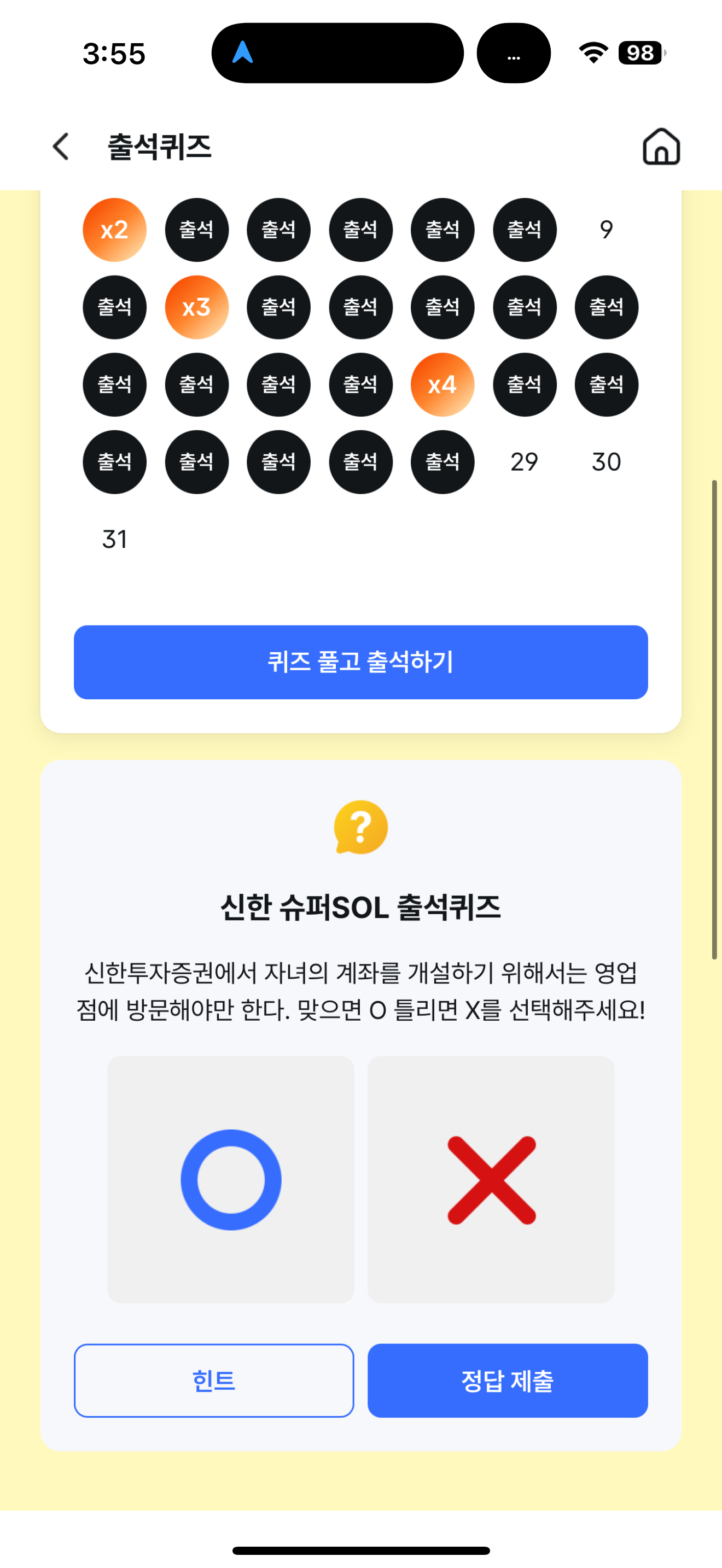 신한 슈퍼SOL 출석퀴즈 정답은 X 입니다