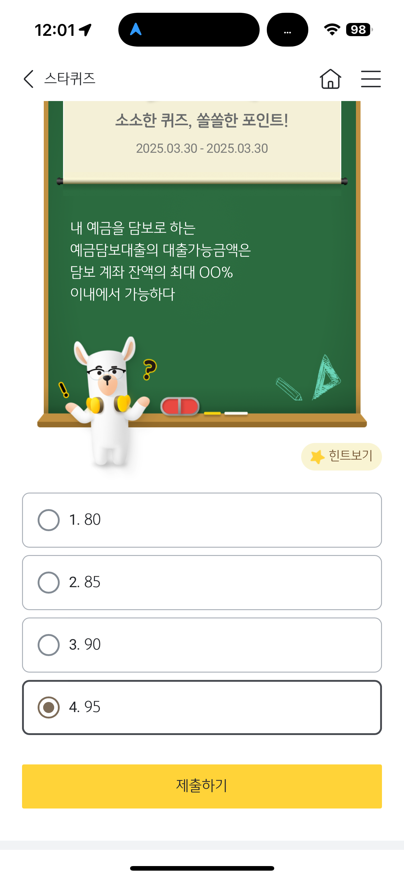 KB스타뱅킹 스타퀴즈 정답은 95 입니다