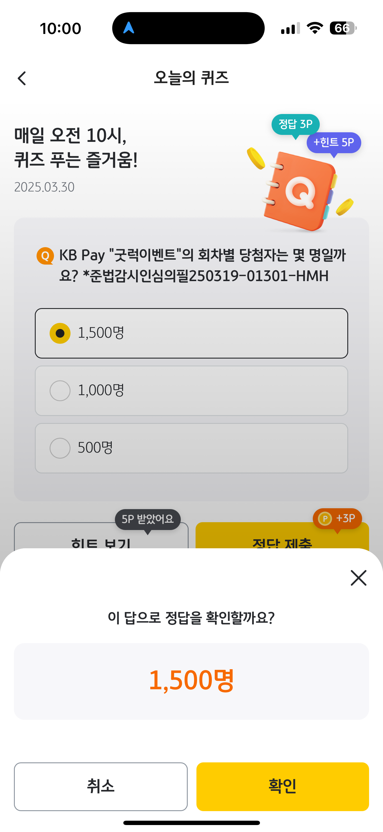 KB Pay 오늘의 퀴즈 정답은 1,500명 입니다