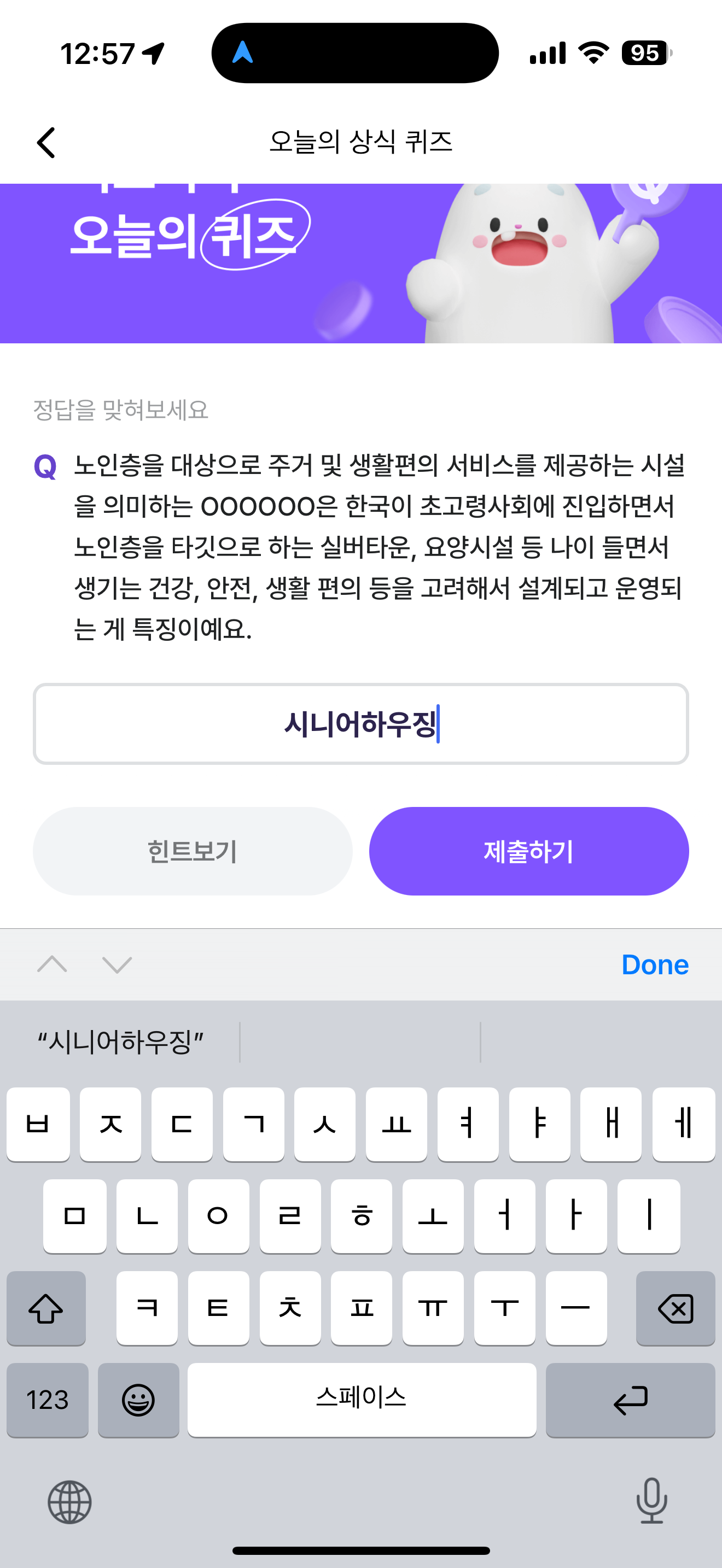 노인층을 대상으로 주거 및 생활편의 서비스를 제공하는 시설을 의미하는 OOOOOO은 한국이 초고령사회에 진입하면서 노인층을 타깃으로 하는 실버타운, 요양시설 등 나이 들면서 생기는 건강, 안전, 생활 편의 등을 고려해서 설계되고 운영되는 게 특징이예요. 주관식 퀴즈인데요.
