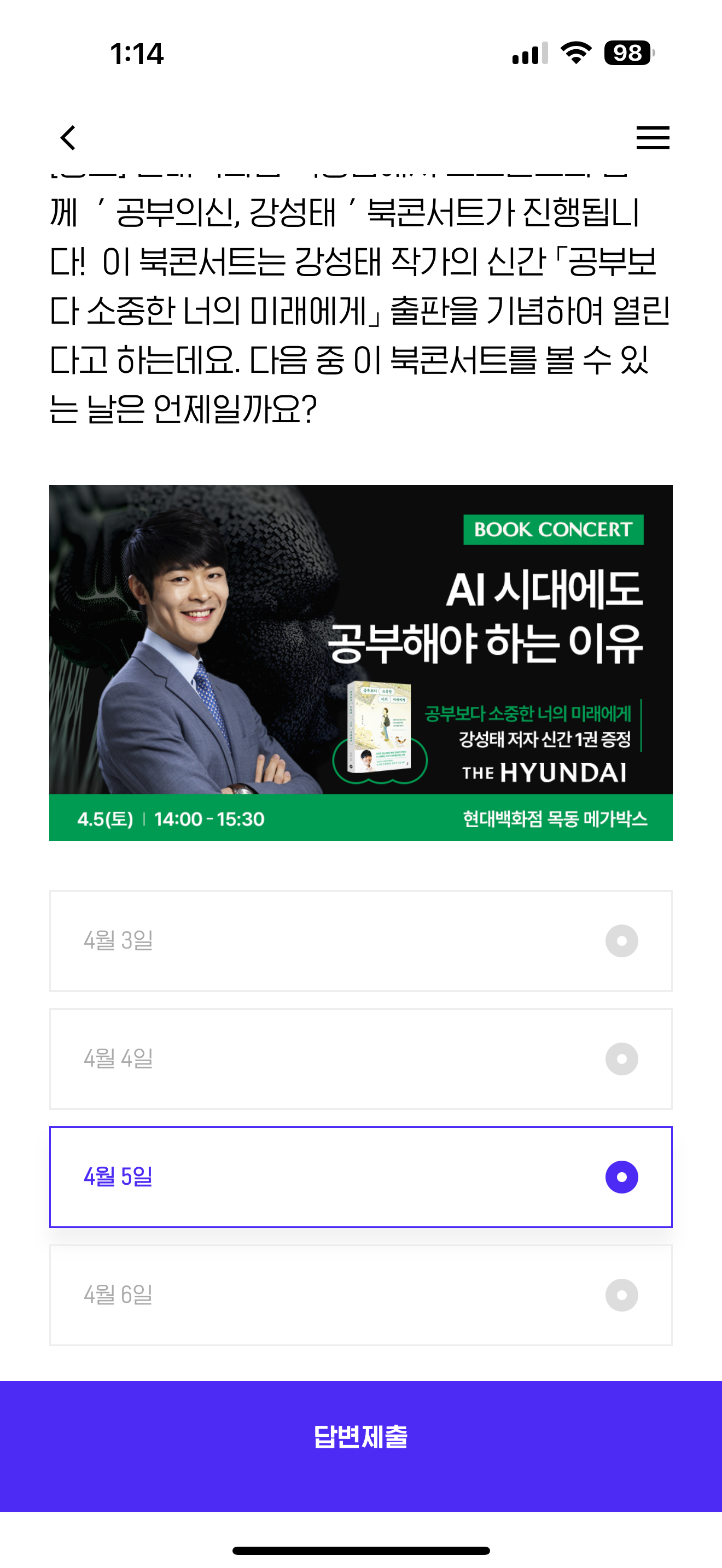 현대백화점 목동점에서 교보문고와 함께 ' 공부의신, 강성태 ' 북콘서트가 진행됩니다! 이 북콘서트는 강성태 작가의 신간 공부보다 소중한 너의 미래에게 출판을 기념하여 열린다고 하는데요. 다음 중 이 북콘서트를 볼 수 있는 날은 언제일까요? 보기는 1. 4월 3일 2. 4월 4일 3. 4월 5일 4. 4월 6일 입니다