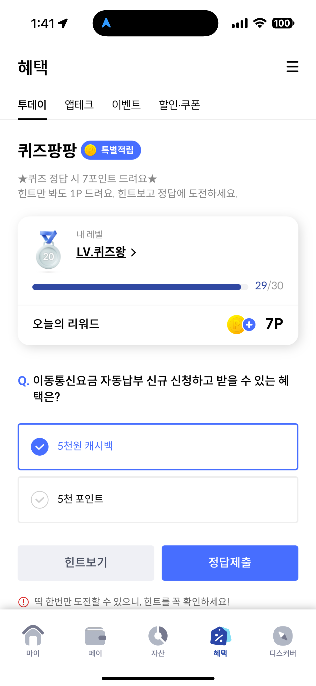 신한카드 퀴즈팡팡 정답은 5천원 캐시백 입니다