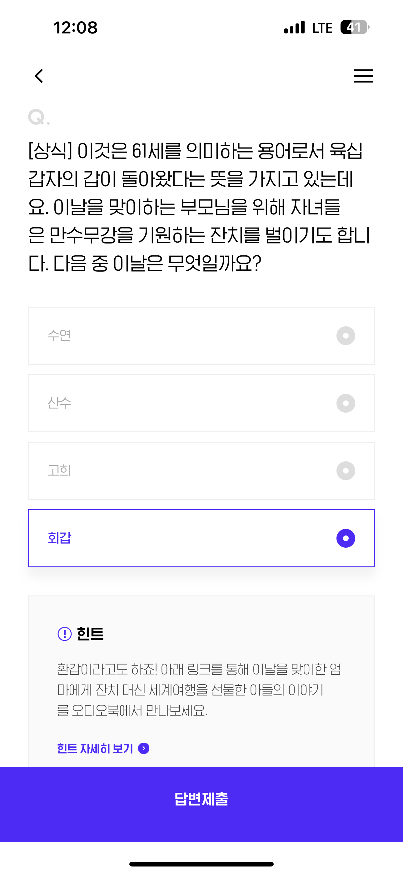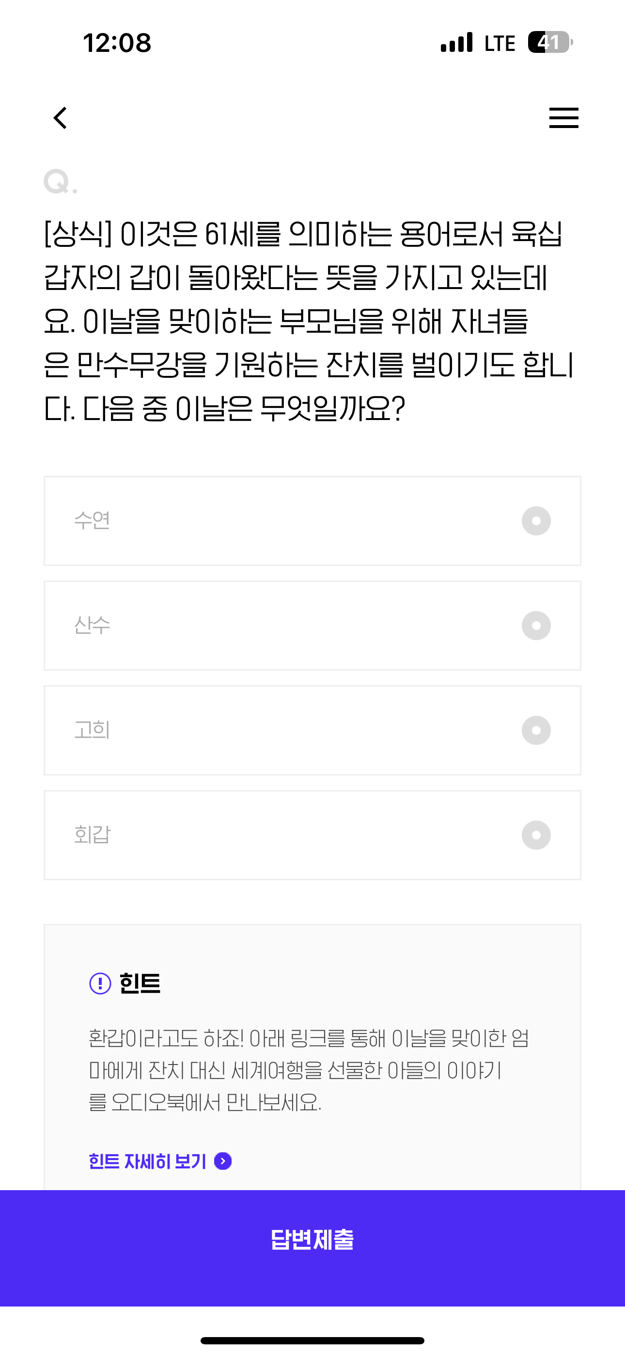 [상식] 이것은 61세를 의미하는 용어로서 육십갑자의 갑이 돌아왔다는 뜻을 가지고 있는데요. 이날을 맞이하는 부모님을 위해 자녀들은 만수무강을 기원하는 잔치를 벌이기도 합니다. 다음 중 이날은 무엇일까요? 보기는 1. 수연 2. 산수 3. 고희 4. 회갑 입니다. 요즘은 환갑 잔치는 잘 안하죠.