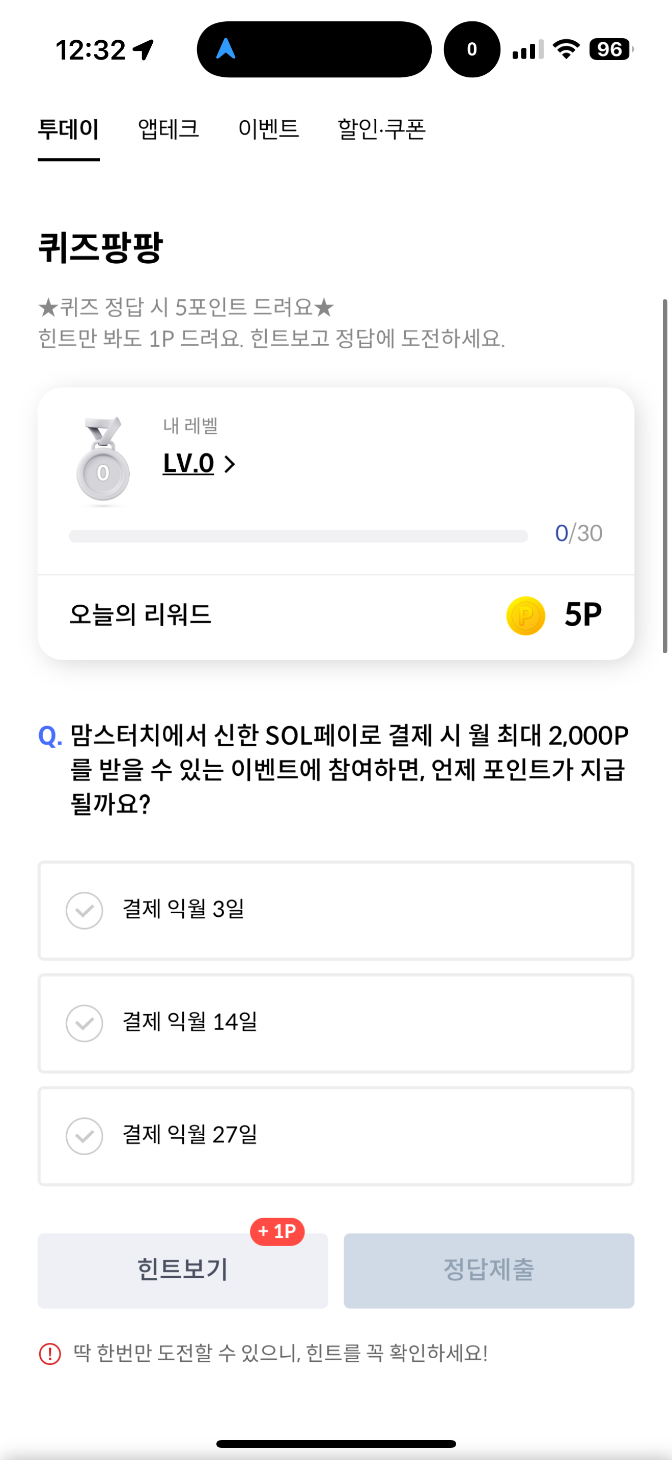 신한카드 퀴즈팡팡 정답은 결제 익월 14일 입니다