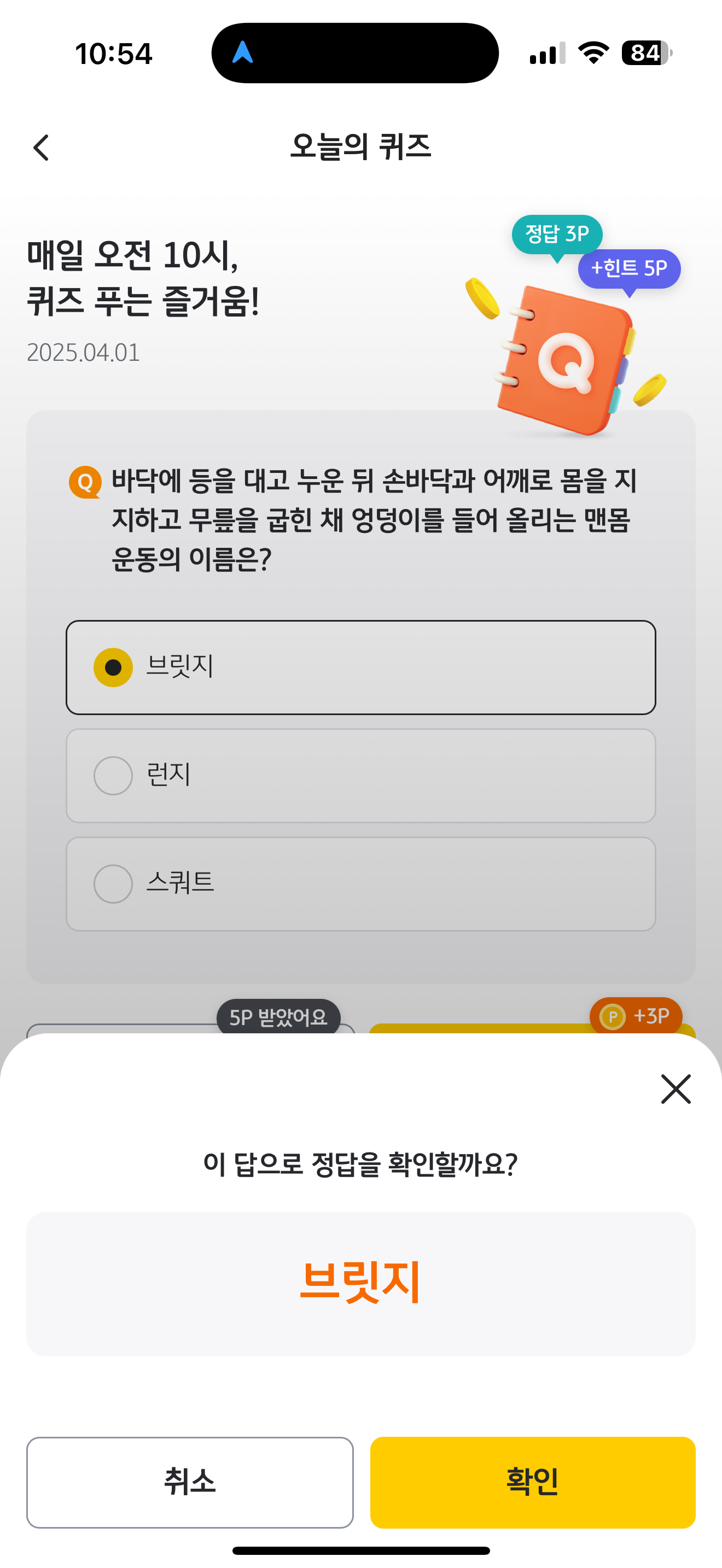 KB Pay 오늘의 퀴즈 4월 1일 정답(바닥에 등을 대고 누운 뒤 손바닥과 어깨로 몸을 지지하고 무릎을 굽힌 채 엉덩이를 들어 올리는 맨몸 운동의 이름은?)