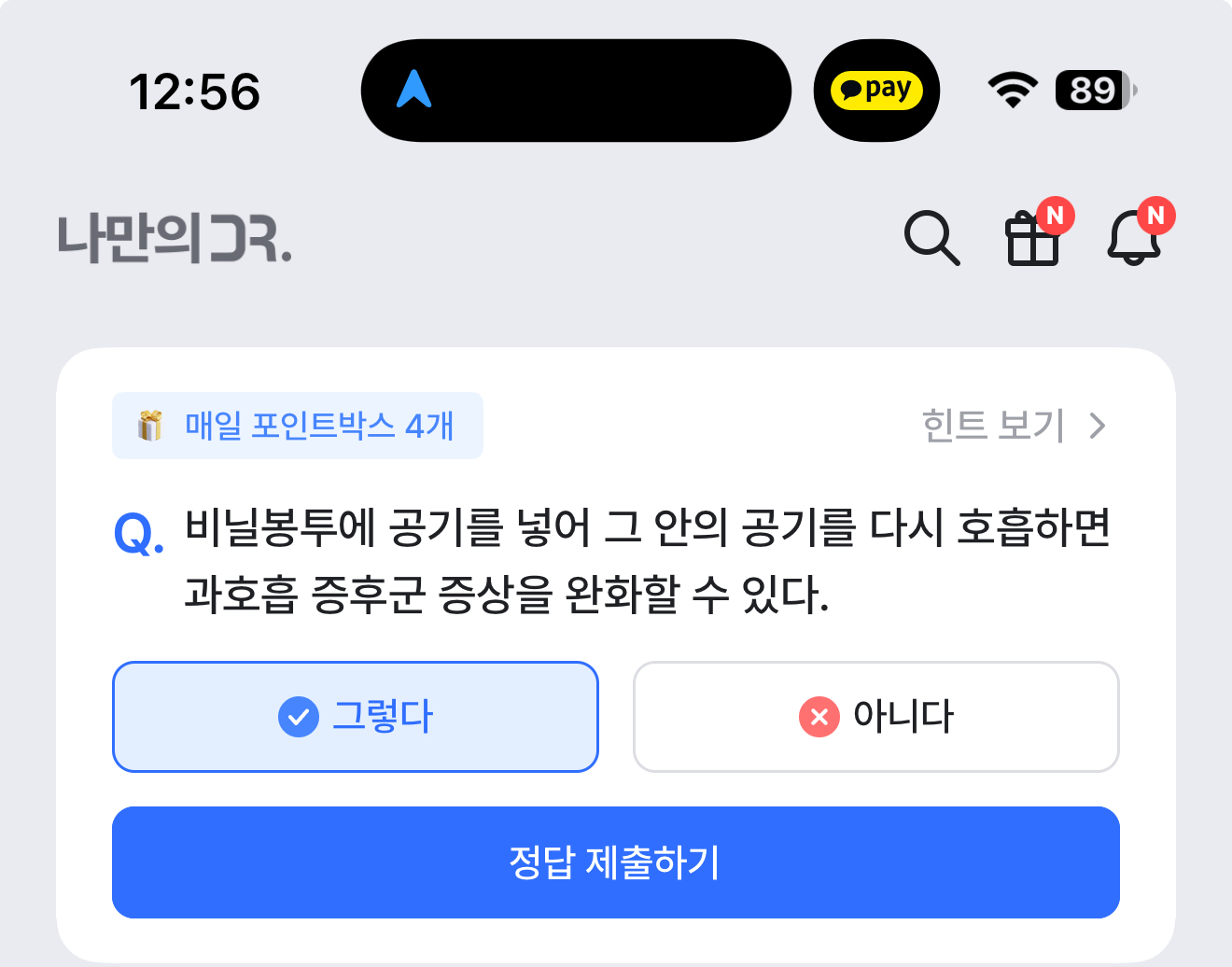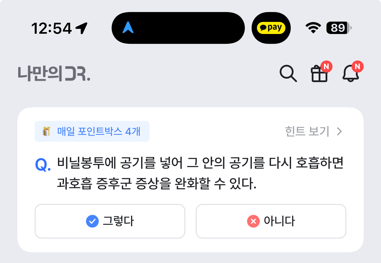 나만의 닥터 퀴즈 4월 2일 정답(비닐봉투에 공기를 넣어 그 안의 공기를 다시 호흡하면 과호흡 증후군 증상을 완화할 수 있다)