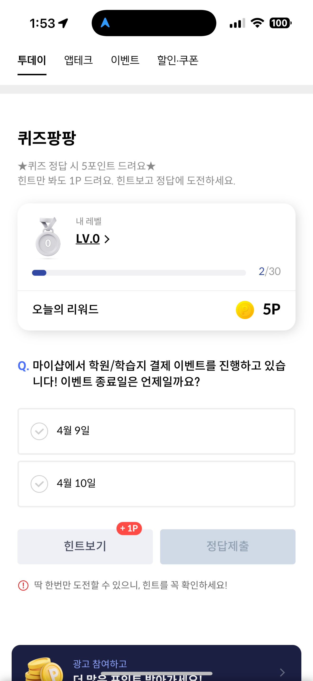 신한카드 퀴즈팡팡 4월 3일 정답(마이샵에서 학원/학습지 결제 이벤트를 진행하고 있습니다! 이벤트 종료일은 언제일까요?)