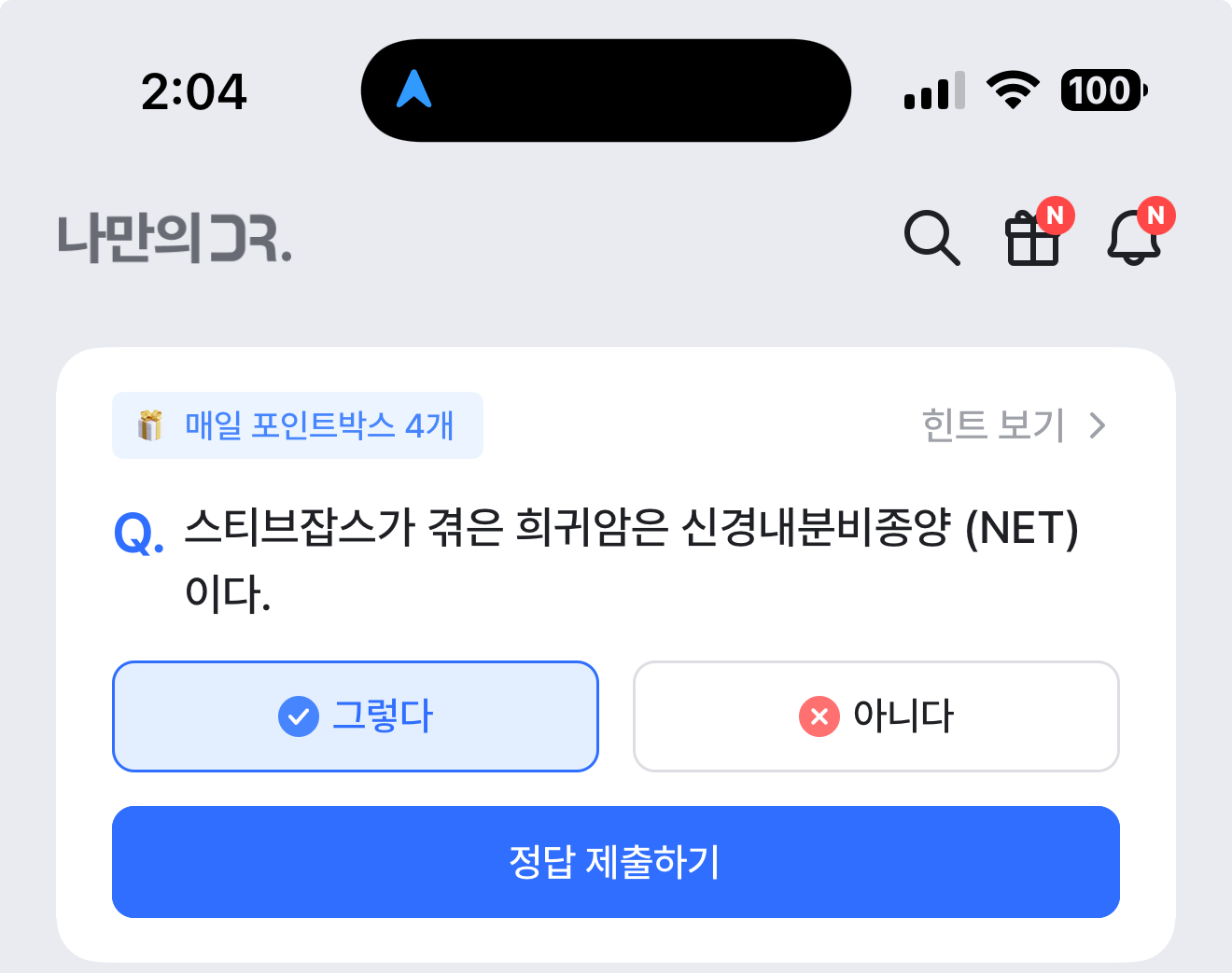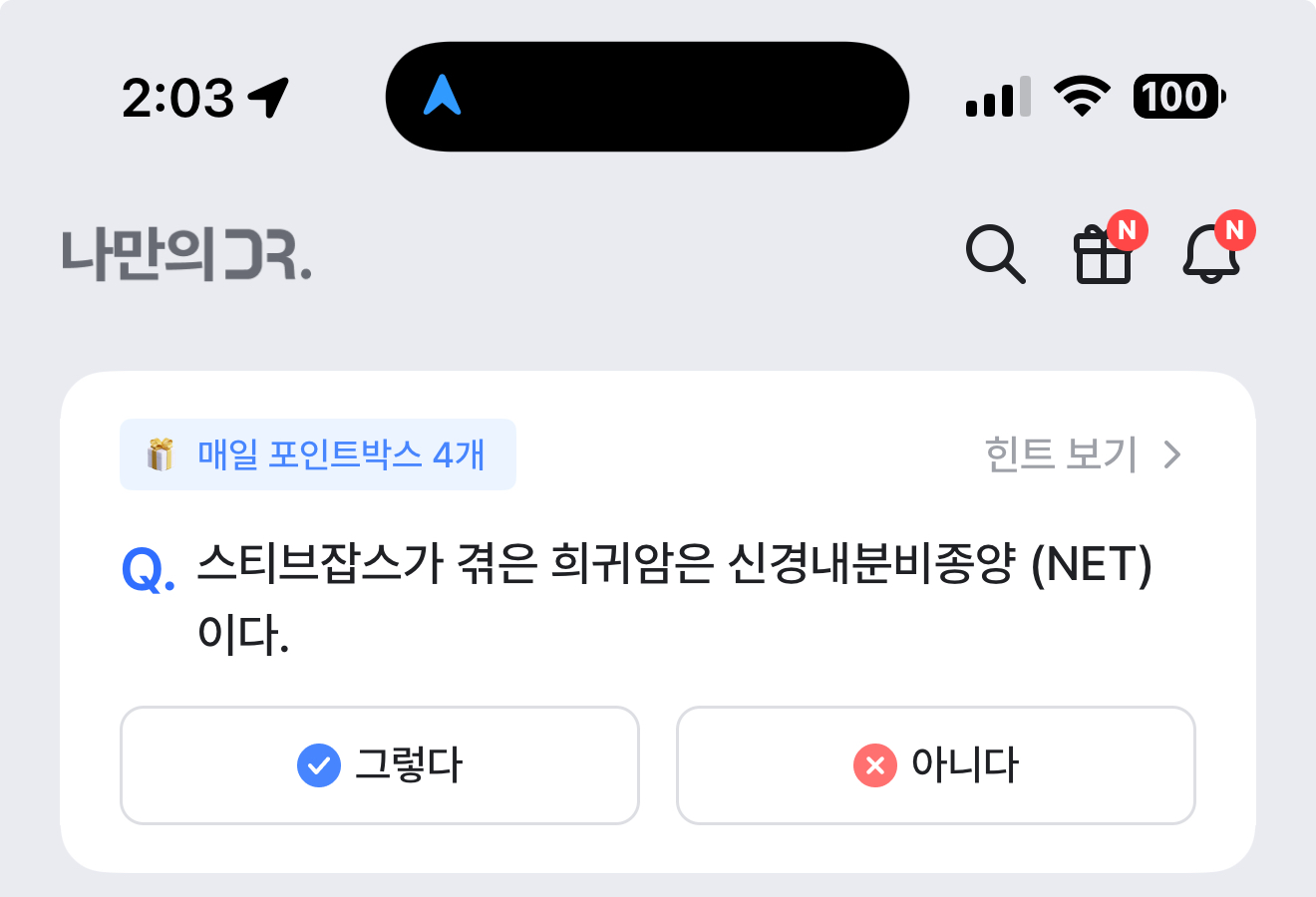 나만의 닥터 퀴즈 4월 3일 정답(스티브잡스가 겪은 희귀암은 신경내분비종양 (NET) 이다.)