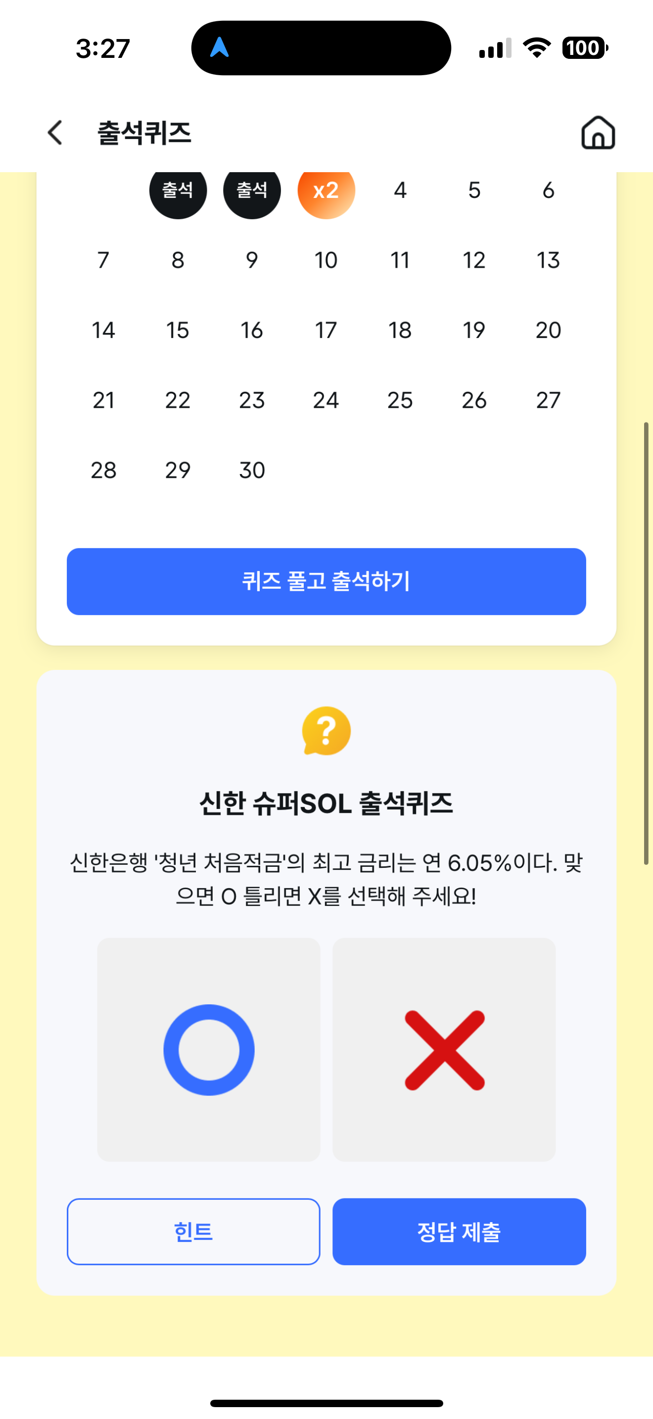 신한 슈퍼SOL 출석퀴즈 정답은 O 입니다