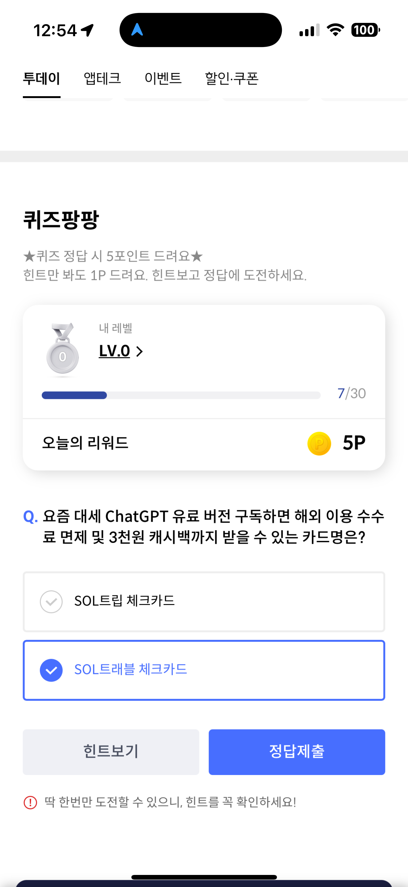 요즘 대세 ChatGPT 유료 버전 구독하면 해외 이용 수수료 면제 및 3천원 캐시백까지 받을 수 있는 카드명은? 보기는 1. SOL트립 체크카드 2. SOL트래블 체크카드 입니다. ChatGPT 요즘 많이들 유료로 넘어가고 있는데 조금이나마 혜택을 볼 수 있으니 참고해 보세요