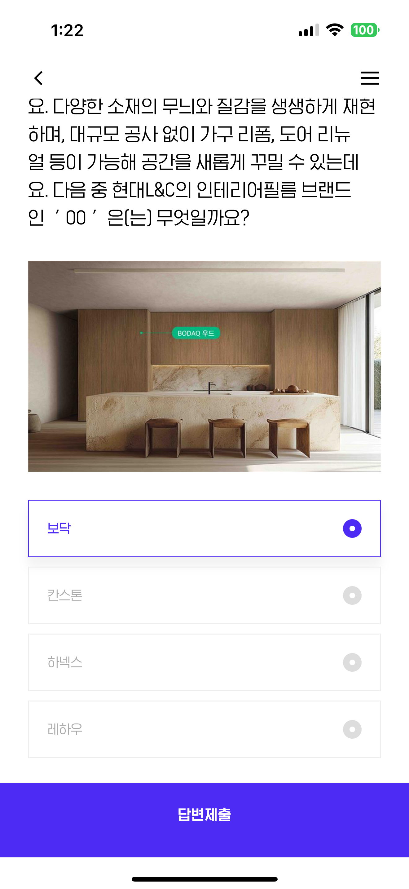 현대L&C에서는 인테리어 트렌드에 맞춰 인테리어 필름 ' 00 ' 신패턴을 선보였어요. 다양한 소재의 무늬와 질감을 생생하게 재현하며, 대규모 공사 없이 가구 리폼, 도어 리뉴얼 등이 가능해 공간을 새롭게 꾸밀 수 있는데요. 다음 중 현대L&C의 인테리어필름 브랜드인 ' 00 ' 은(는) 무엇일까요? 보기는 1. 보닥 2. 칸스톤 3. 하넥스 4. 레하우 입니다
