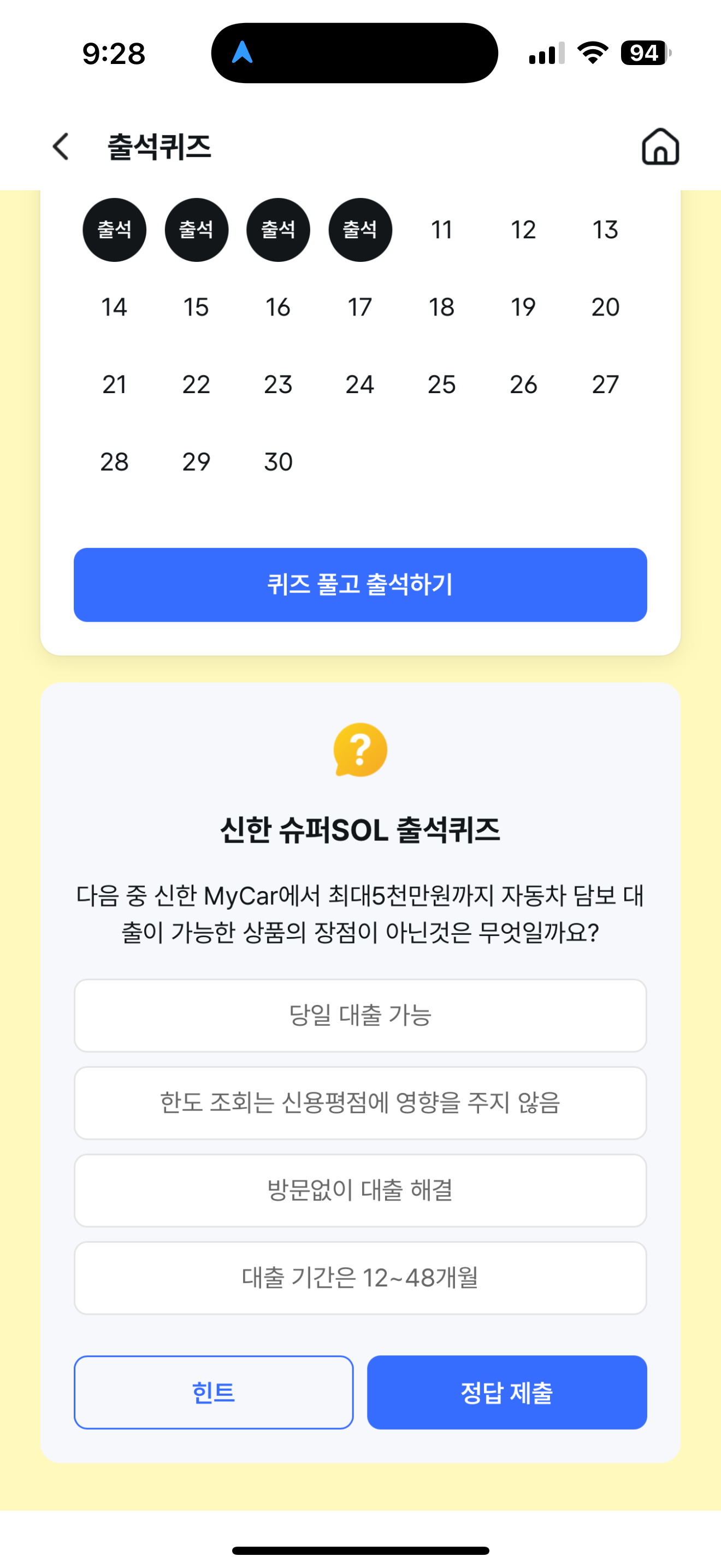 신한 슈퍼SOL 출석퀴즈 정답은 대출 기간은 12~48개월 입니다