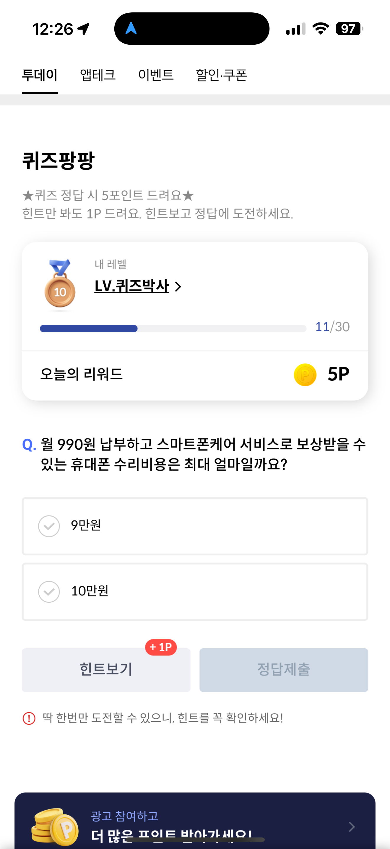 신한카드 퀴즈팡팡 정답은 10만원 입니다