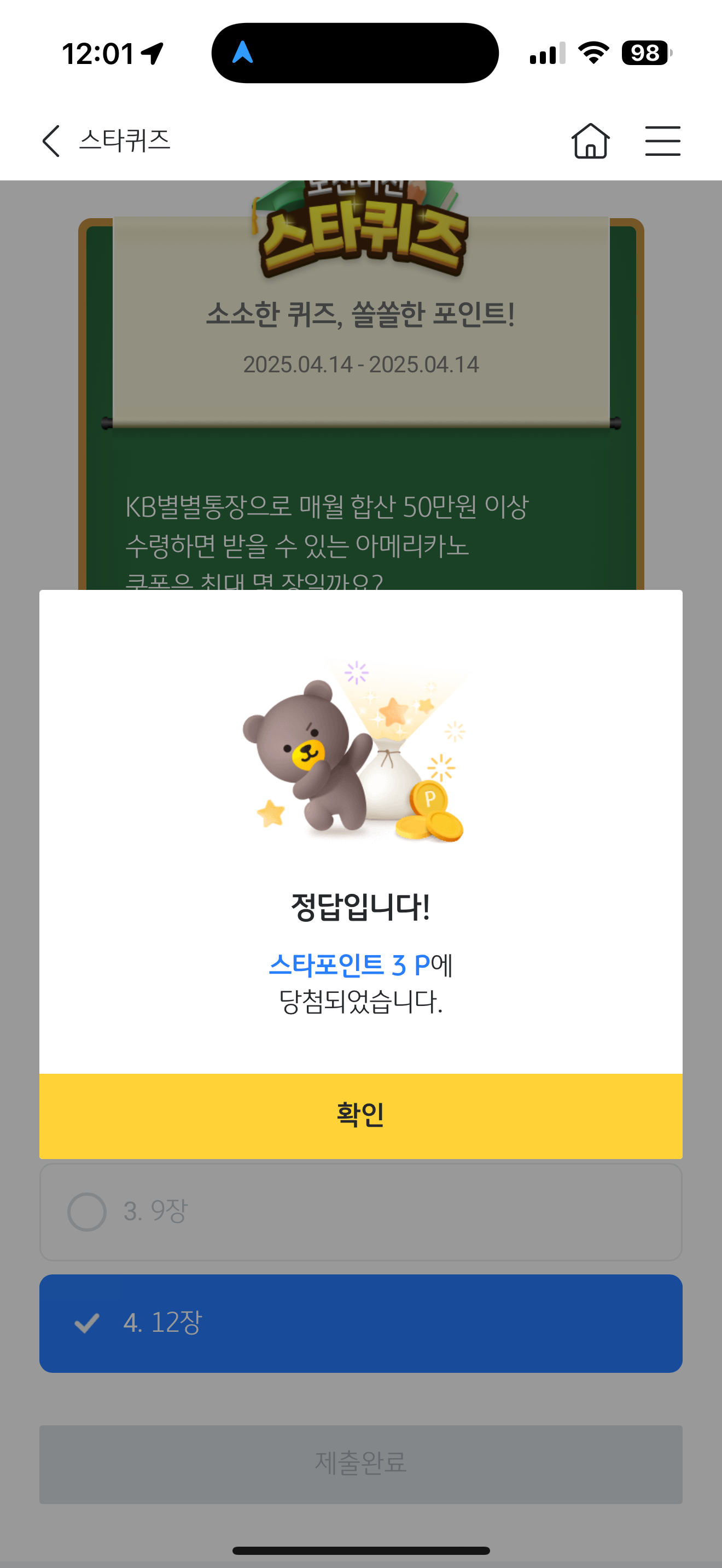 KB스타뱅킹 스타퀴즈 정답은 12장 입니다