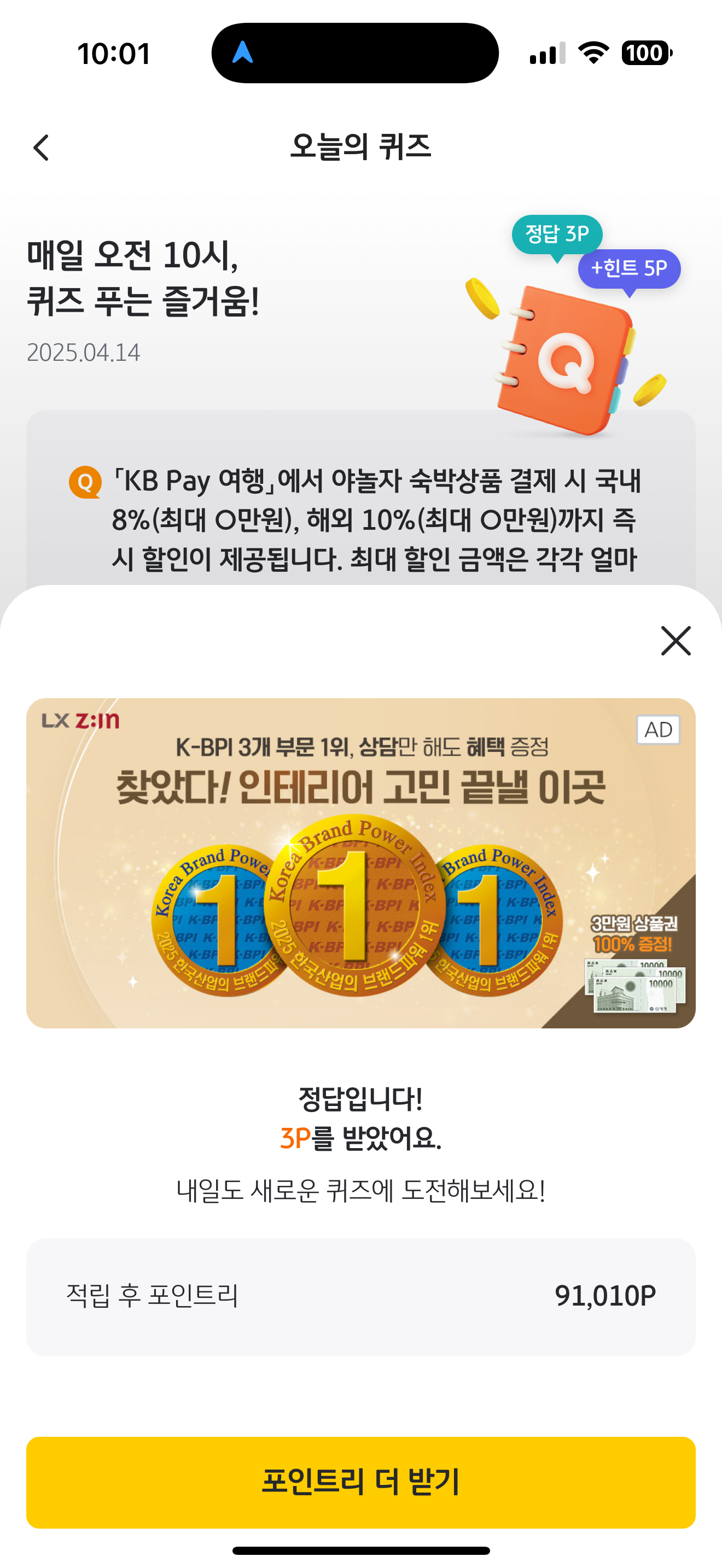 KB Pay 오늘의 퀴즈 4월 14일 정답(KB Pay 여행 에서 야놀자 숙박상품 결제 시 국내 8%(최대 O만원), 해외 10%(최대 O만원)까지 즉시 할인이 제공됩니다. 최대 할인 금액은 각각 얼마일까요?)