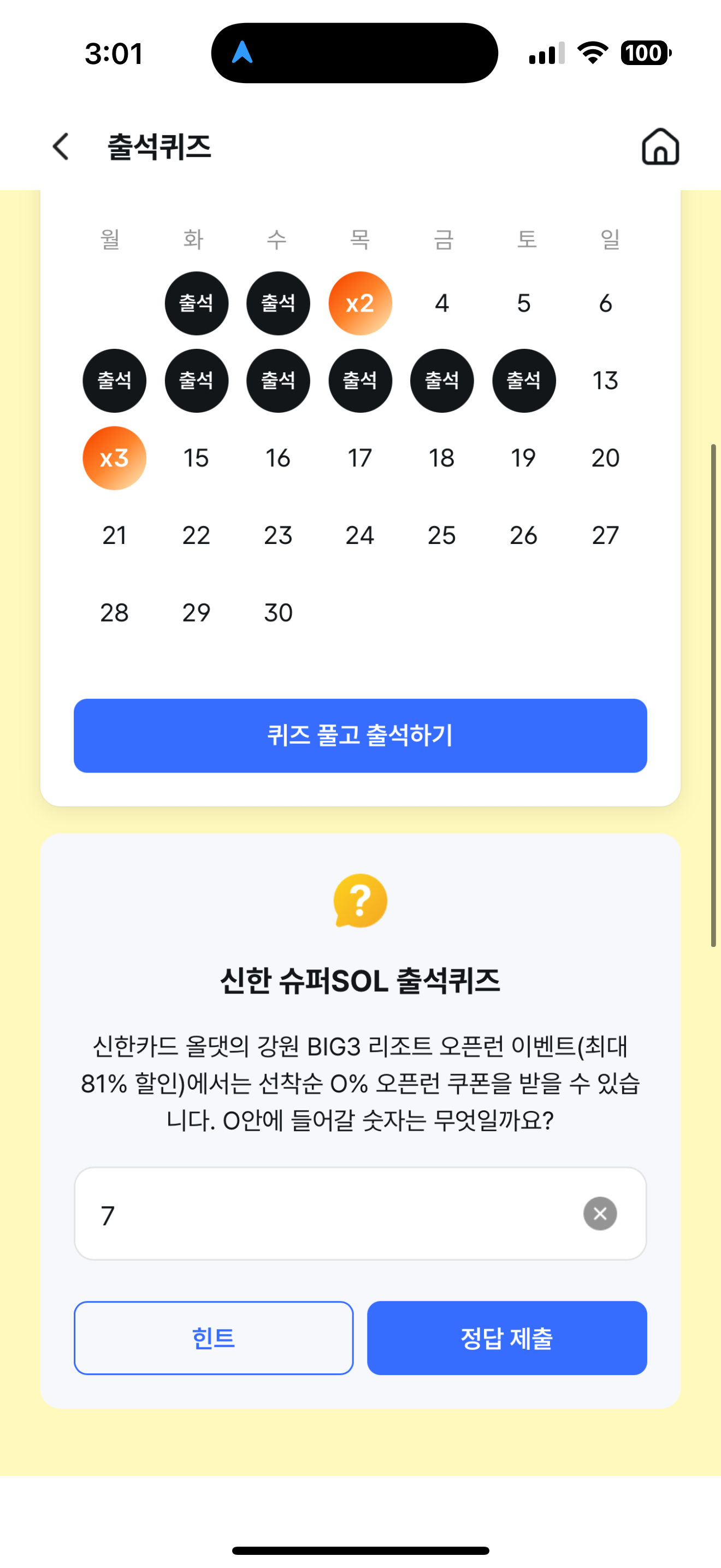 신한 슈퍼SOL 출석퀴즈 정답은 7 입니다
