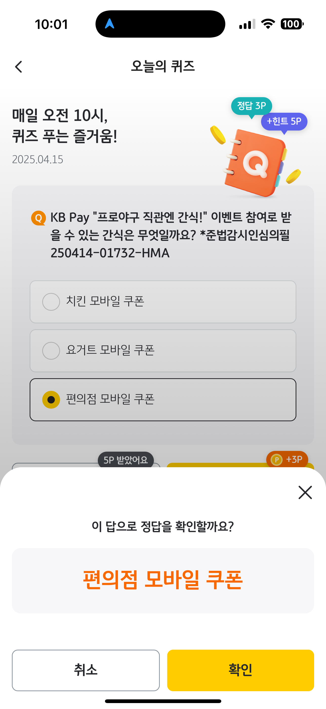 KB Pay 오늘의 퀴즈 정답은 편의점 모바일 쿠폰 입니다