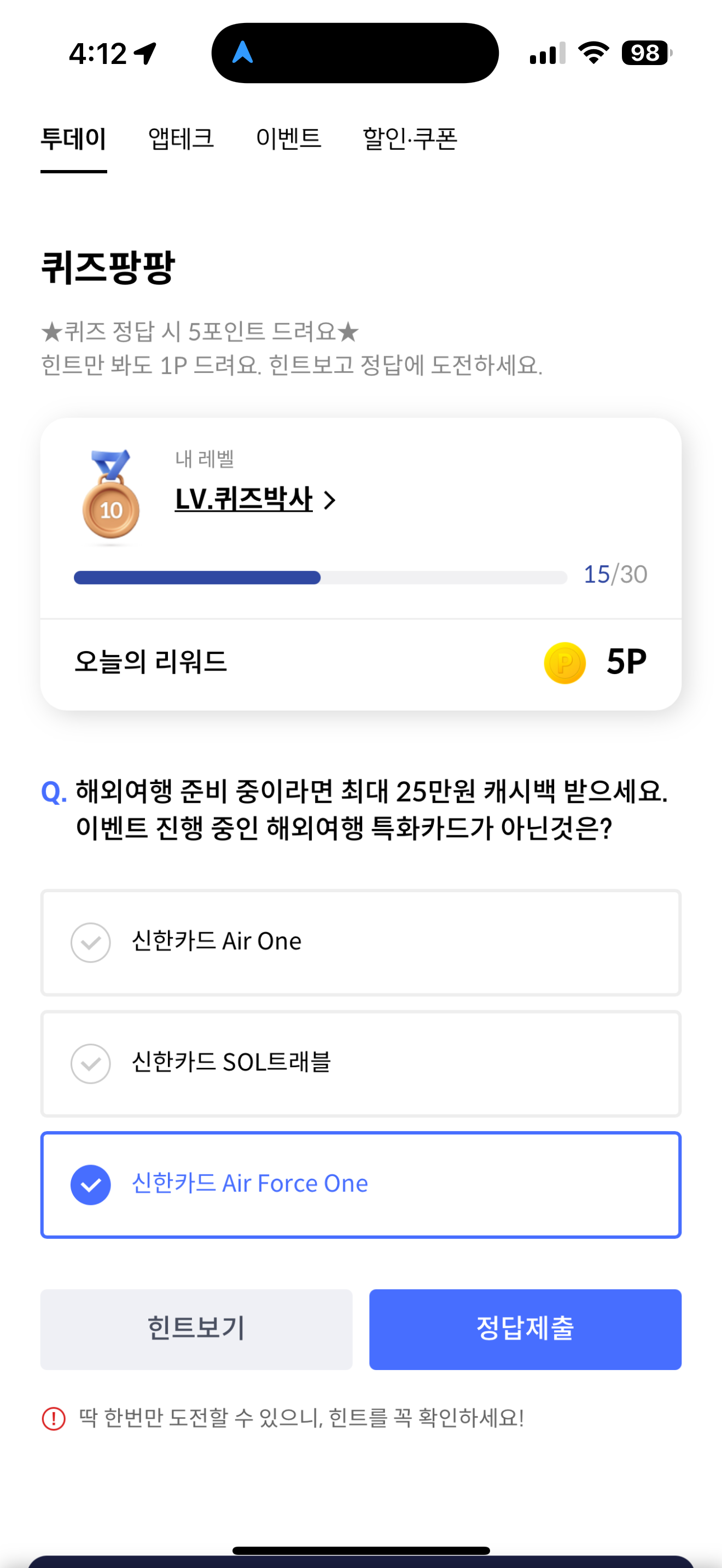 신한카드 퀴즈팡팡 정답은 신한카드 Air Force One 입니다