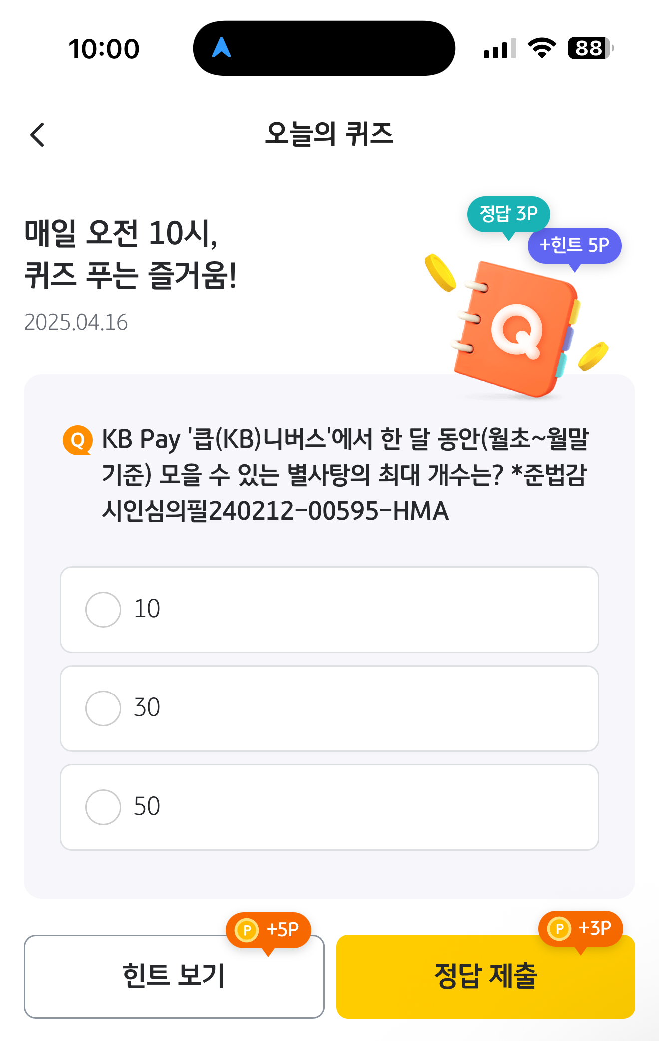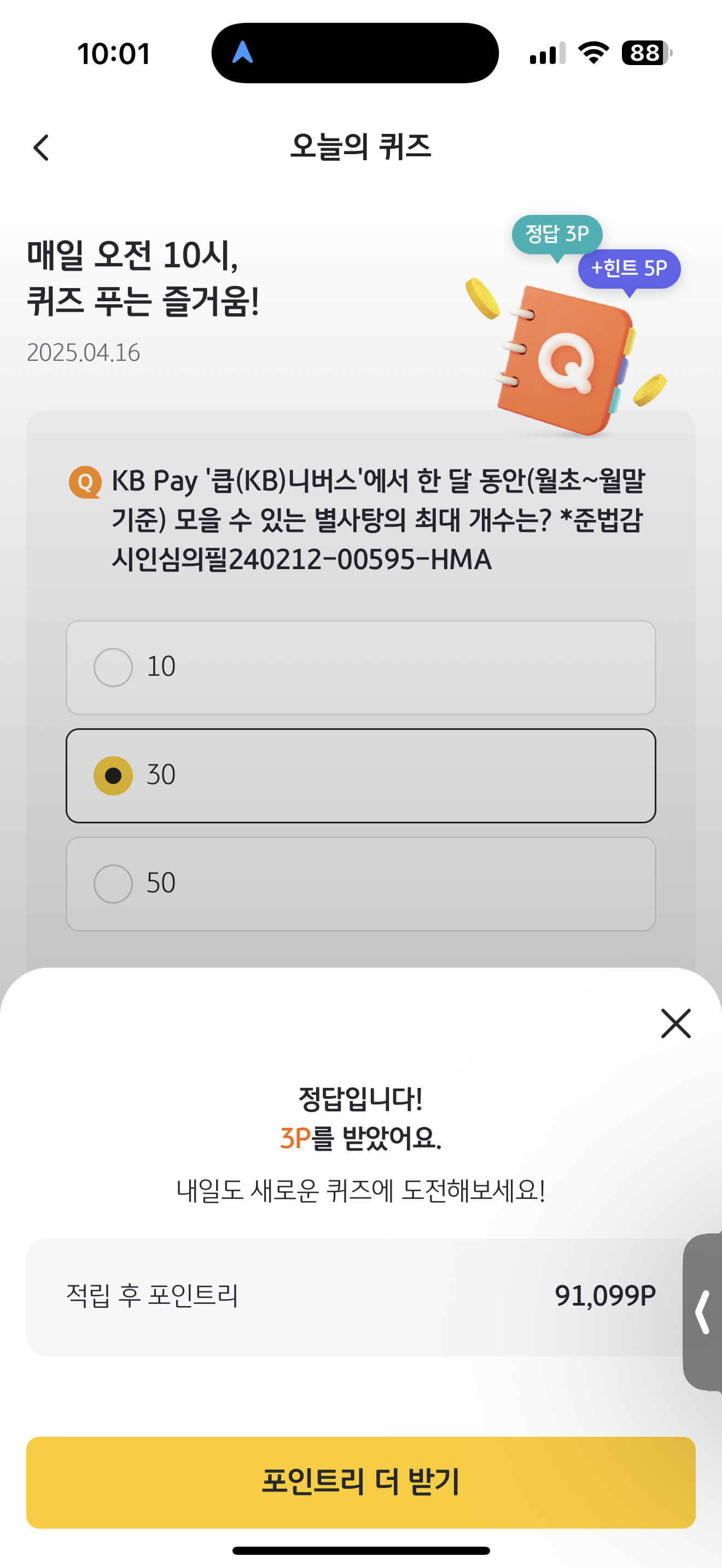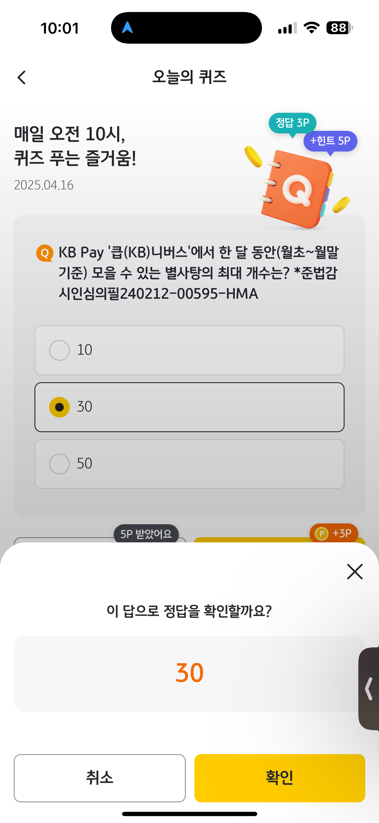 KB Pay 오늘의 퀴즈 정답은 30 입니다