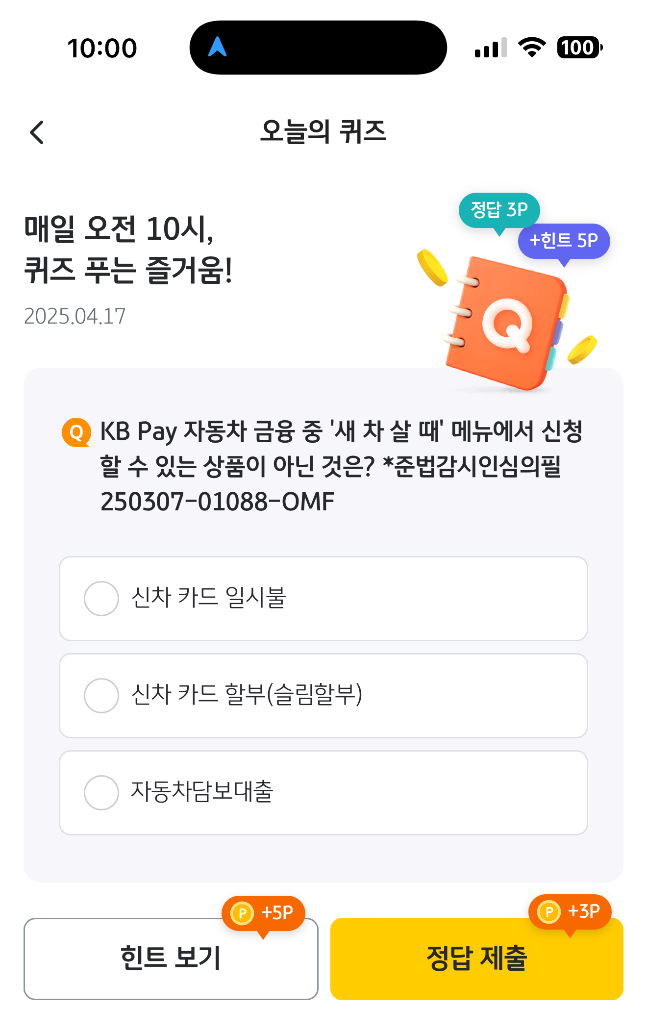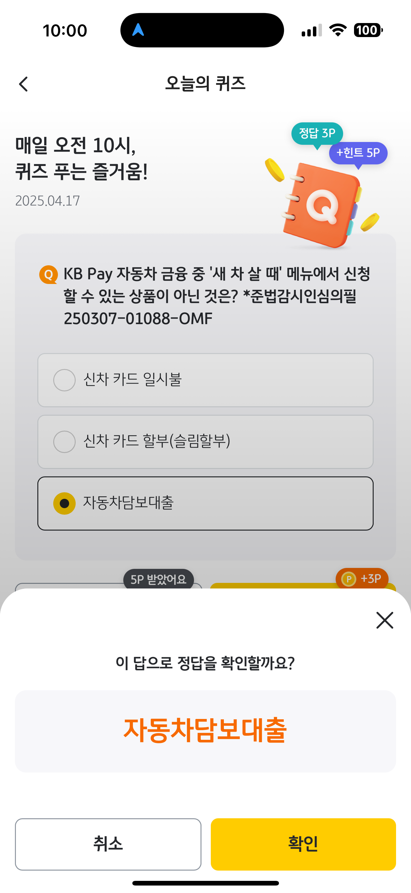 KB Pay 오늘의 퀴즈 정답은 자동차담보대출 입니다