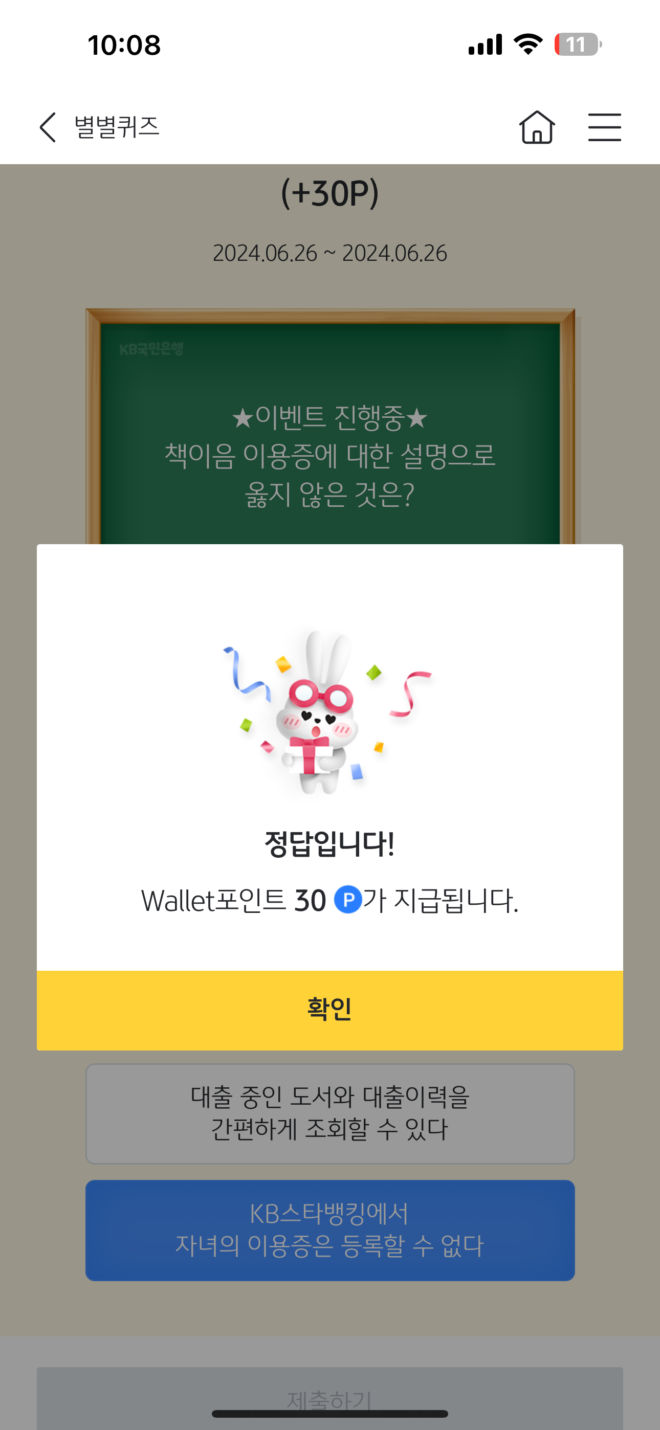 ★이벤트 진행중★ 책이음 이용중에 대한 설명으로 옳지 않은 것은? 보기는 1. KB스타뱅킹 국민지갑에서 쉽게 등록할 수 있다 2. 책이음 이용증으로 전국참여도서관에서 책을 빌릴 수 있다 3. 대출 중인 도서와 대출이력을 간편하게 조회할 수 있다 4. KB스타뱅킹에서 자녀의 이용증은 등록할 수 없다
