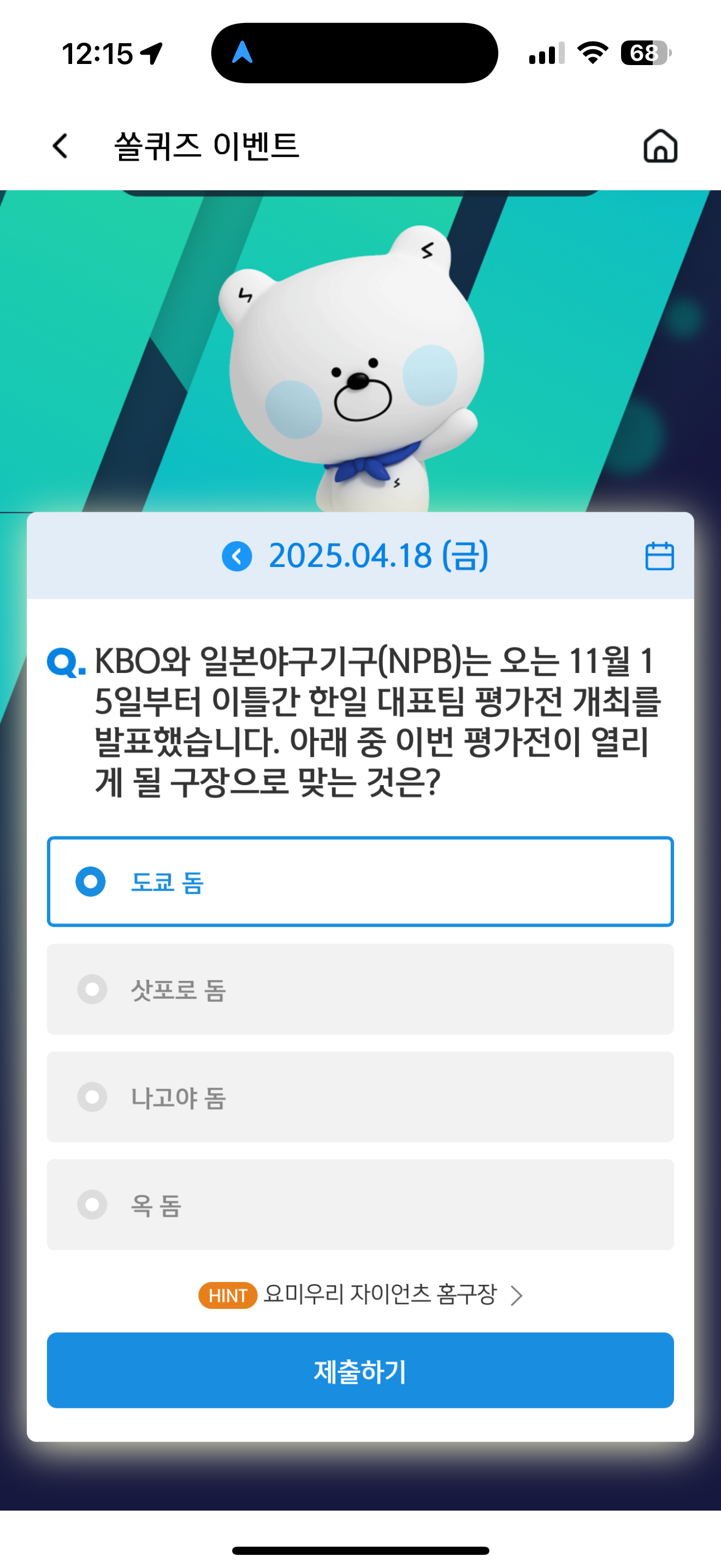 신한 슈퍼SOL 야구/상식 쏠퀴즈 정답은 도쿄 돔 입니다