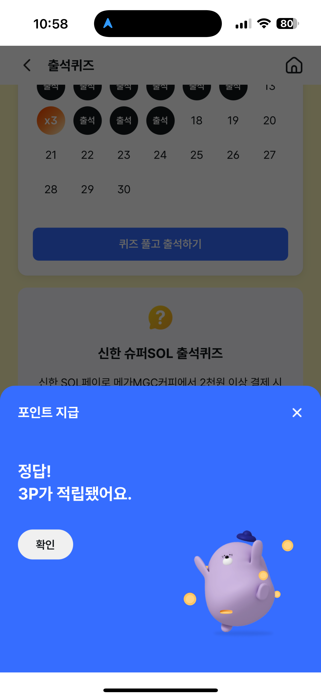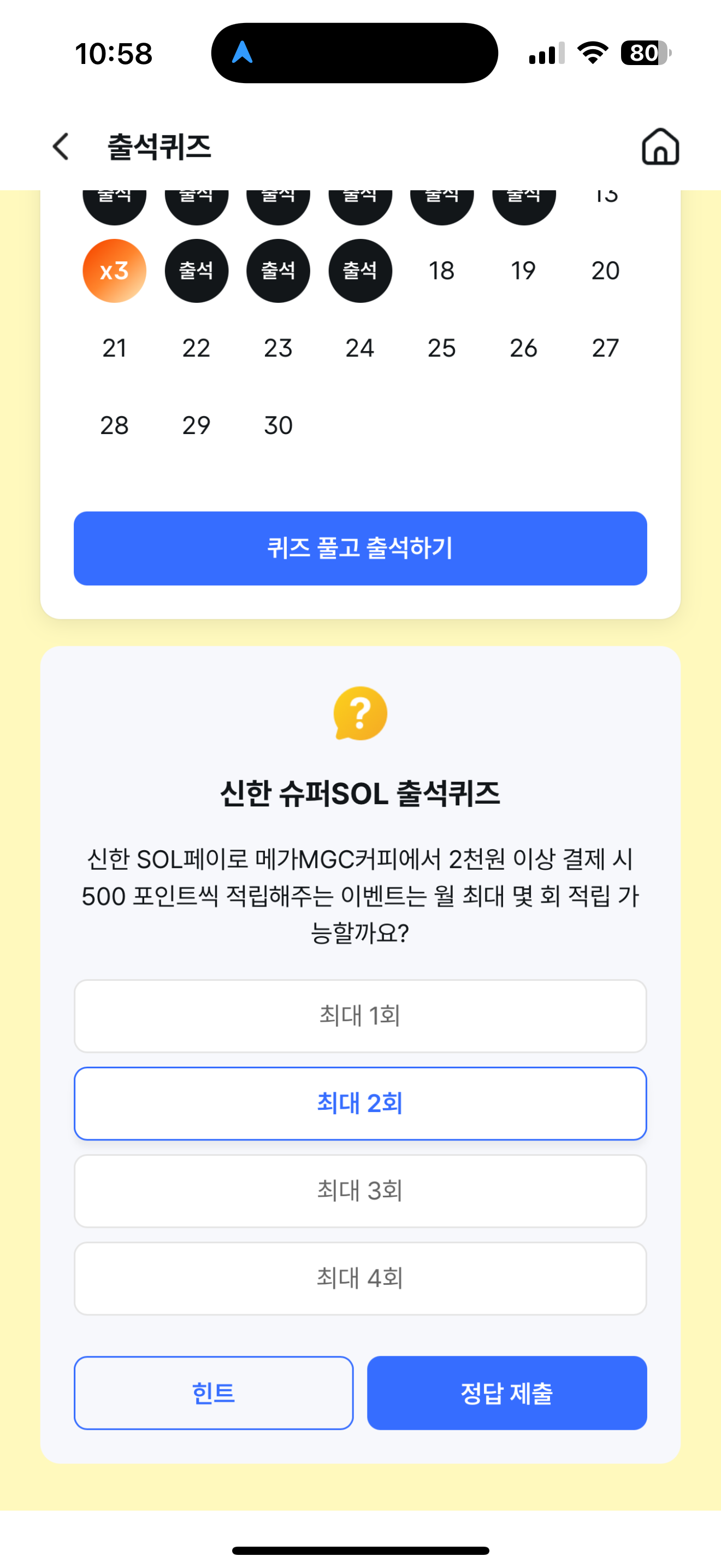 신한 슈퍼SOL 출석퀴즈 정답은 최대 2회 입니다