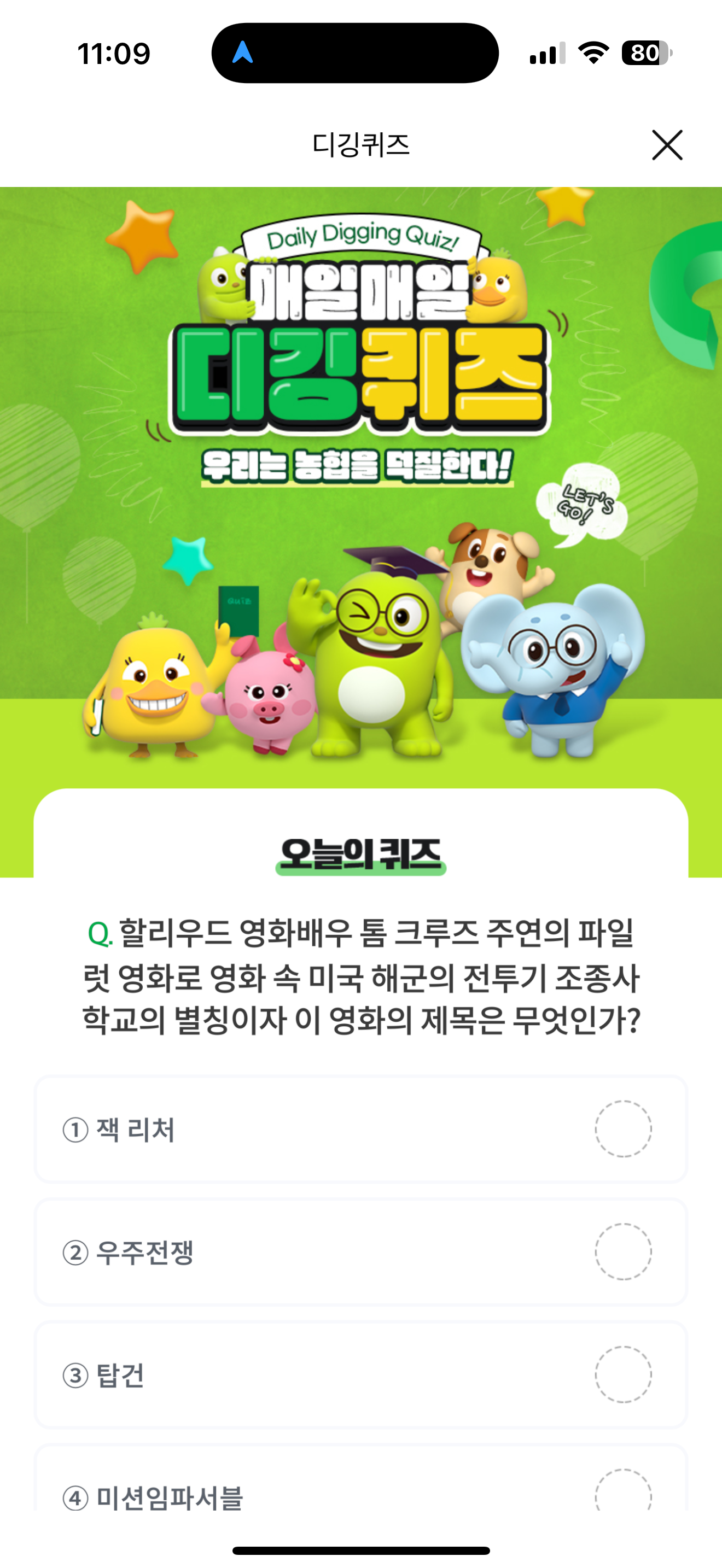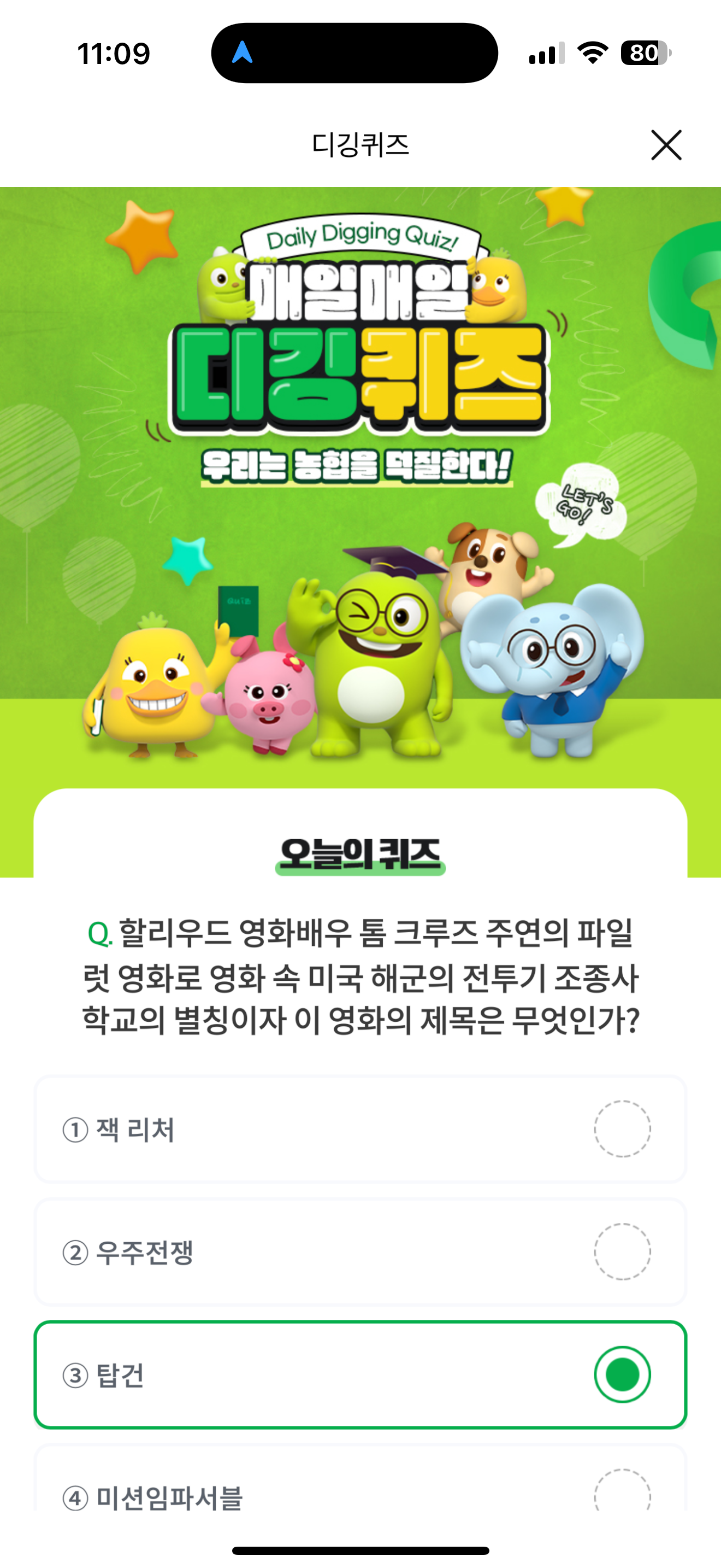 NH올원뱅크 디깅퀴즈 정답은 탑건 입니다