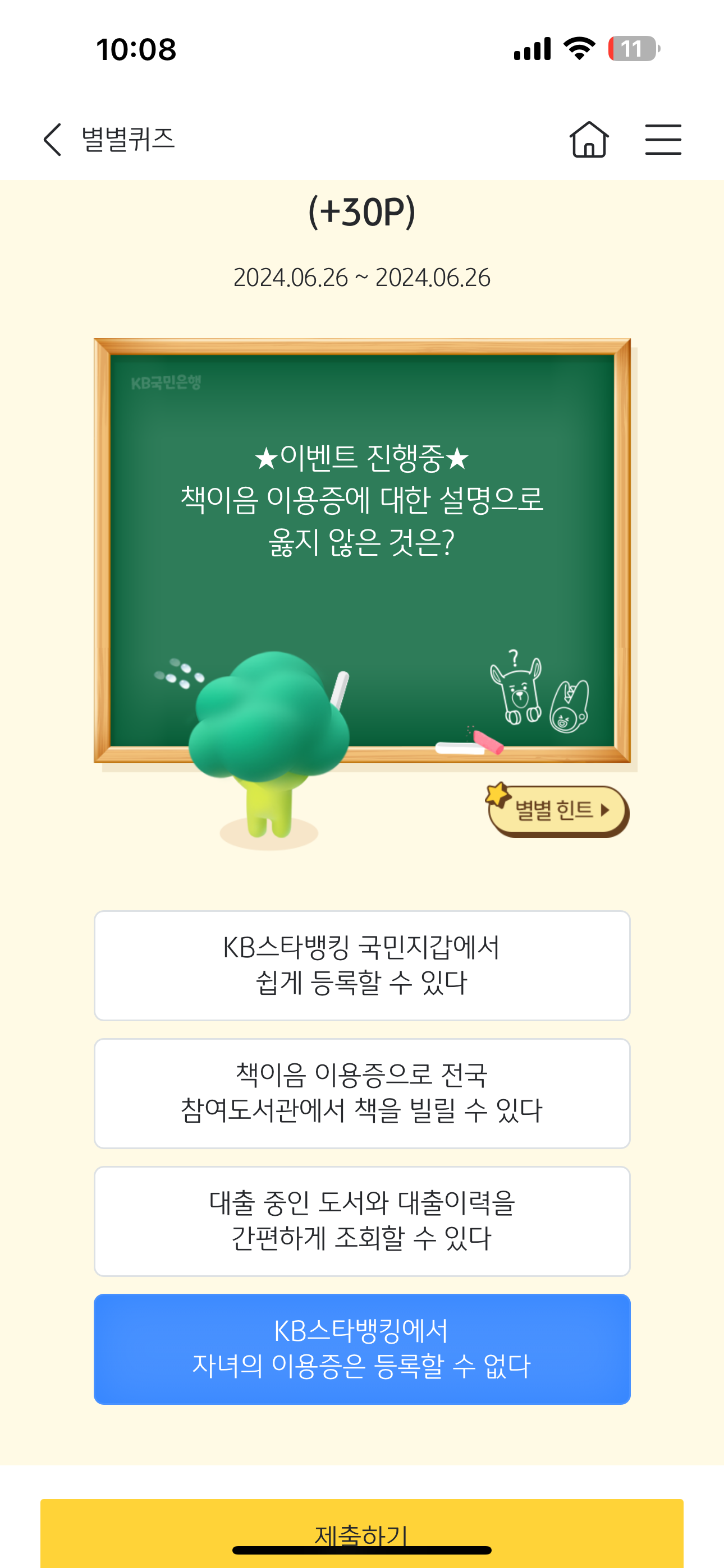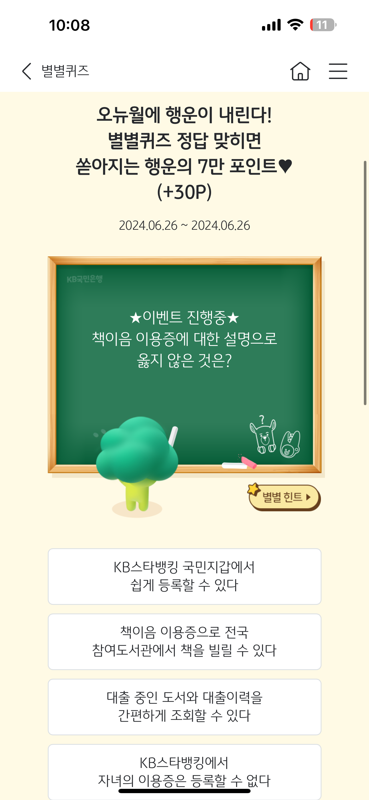 KB스타뱅킹 별별퀴즈 6월 26일 정답(책이음 이용중에 대한 설명으로 옳지 않은 것은?)