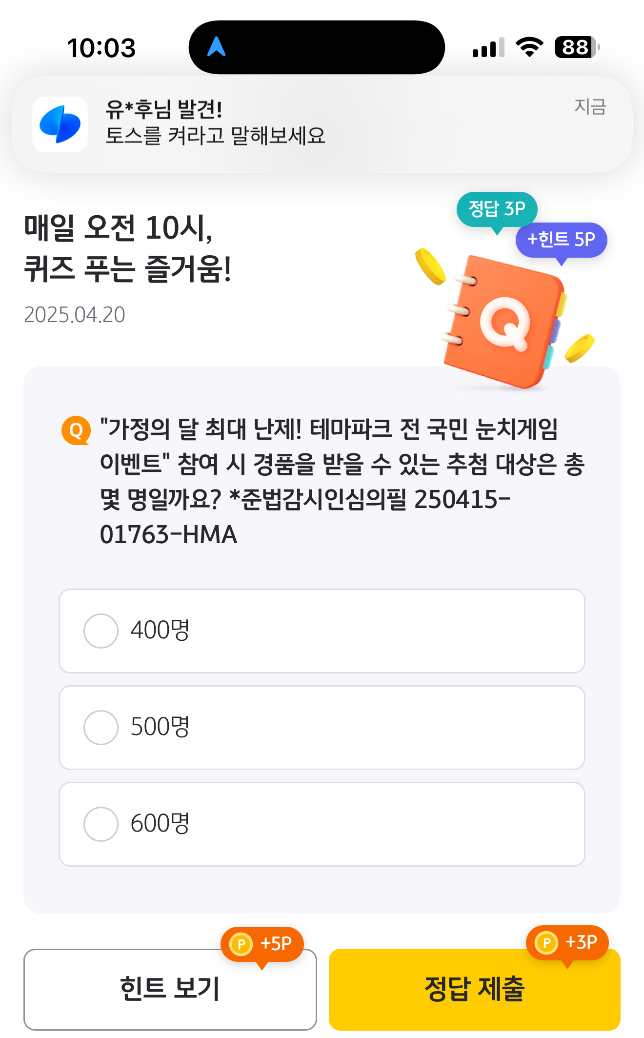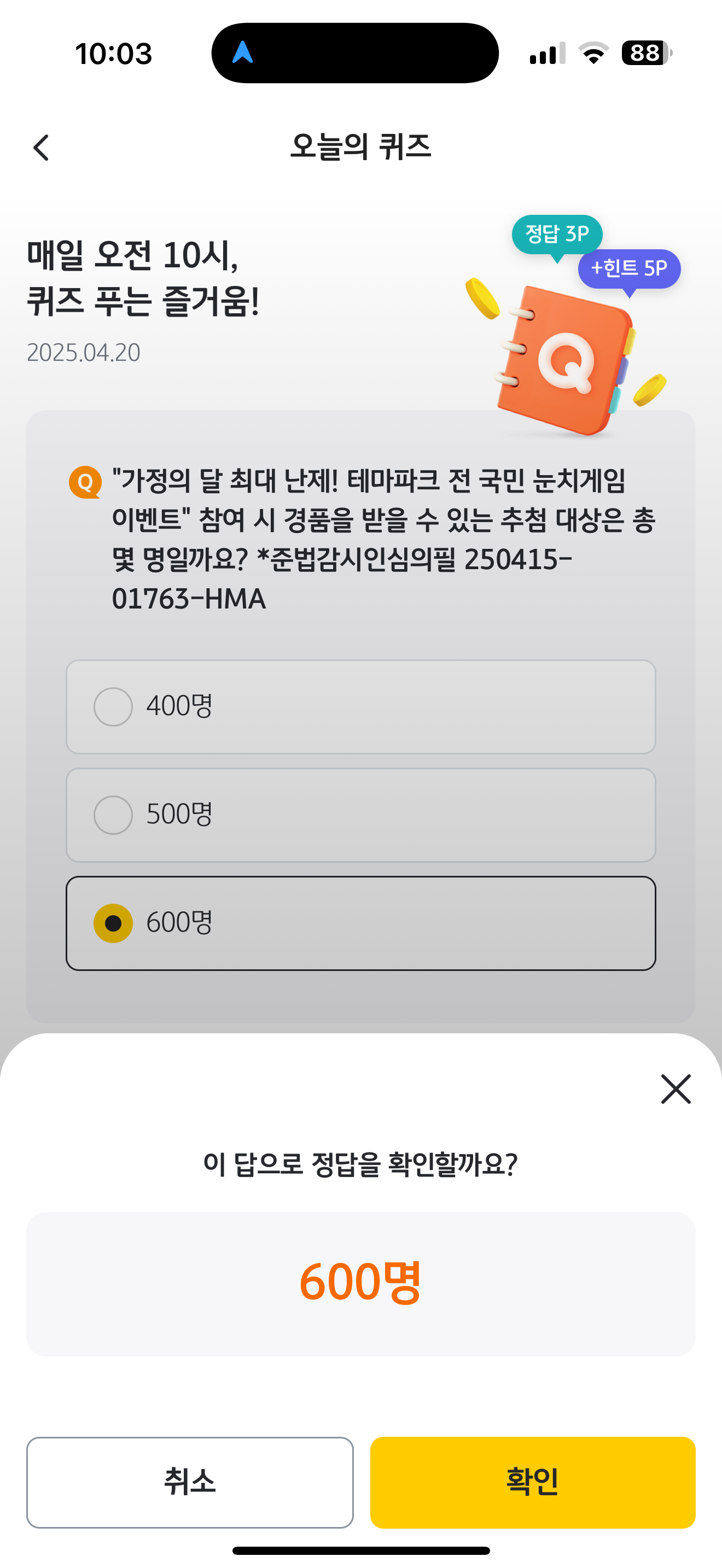 "가정의 달 최대 난제! 테마파크 전 국민 눈치게임 이벤트" 참여 시 경품을 받을 수 있는 추첨 대상은 총 몇 명일까요? *준법감시인심의필 250415-01763-HMA 보기는 1. 400명 2. 500명 3. 600명 입니다. 가정의 달에는 엄청난 인파가 몰리는 곳이 테마파크죠 참고해 두세요