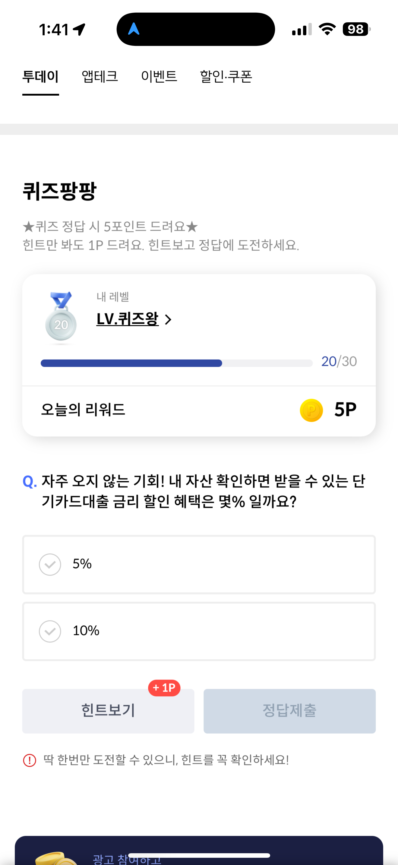 신한카드 퀴즈팡팡 정답은 10% 입니다