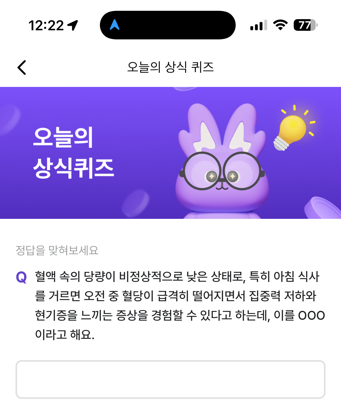 혈액 속의 당량이 비정상적으로 낮은 상태로, 특히 아침 식사를 거르면 오전 중 혈당이 급격히 떨어지면서 집중력 저하와 현기증을 느끼는 증상을 경험할 수 있다고 하는데, 이를 OOO이라고 해요. 주관식 퀴즈인데요. 혈당에 문제가 생기는 사람들이 점점 많아지고 있죠. 건강관리가 정말 중요합니다.