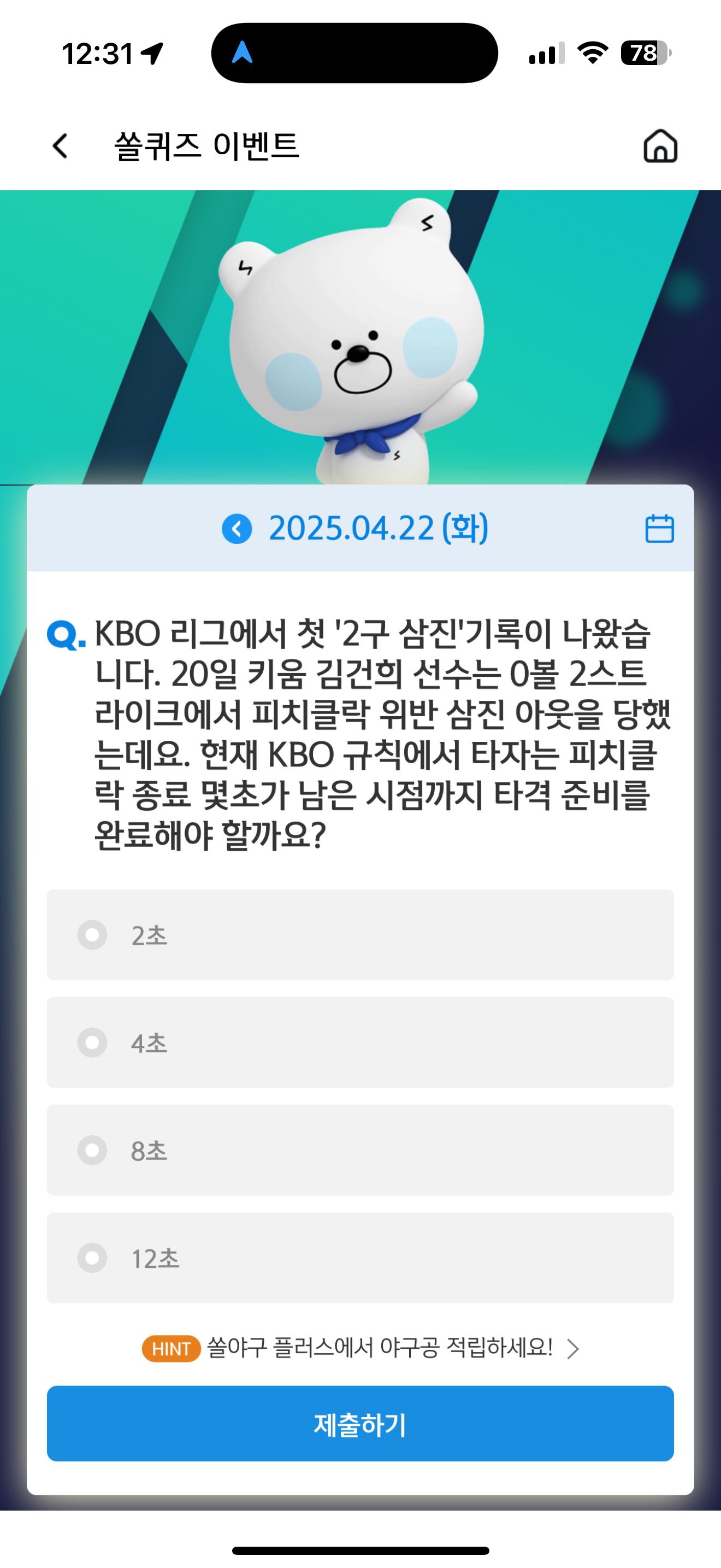 신한 슈퍼sOL 야구/상식 쏠퀴즈 정답은 8초 입니다
