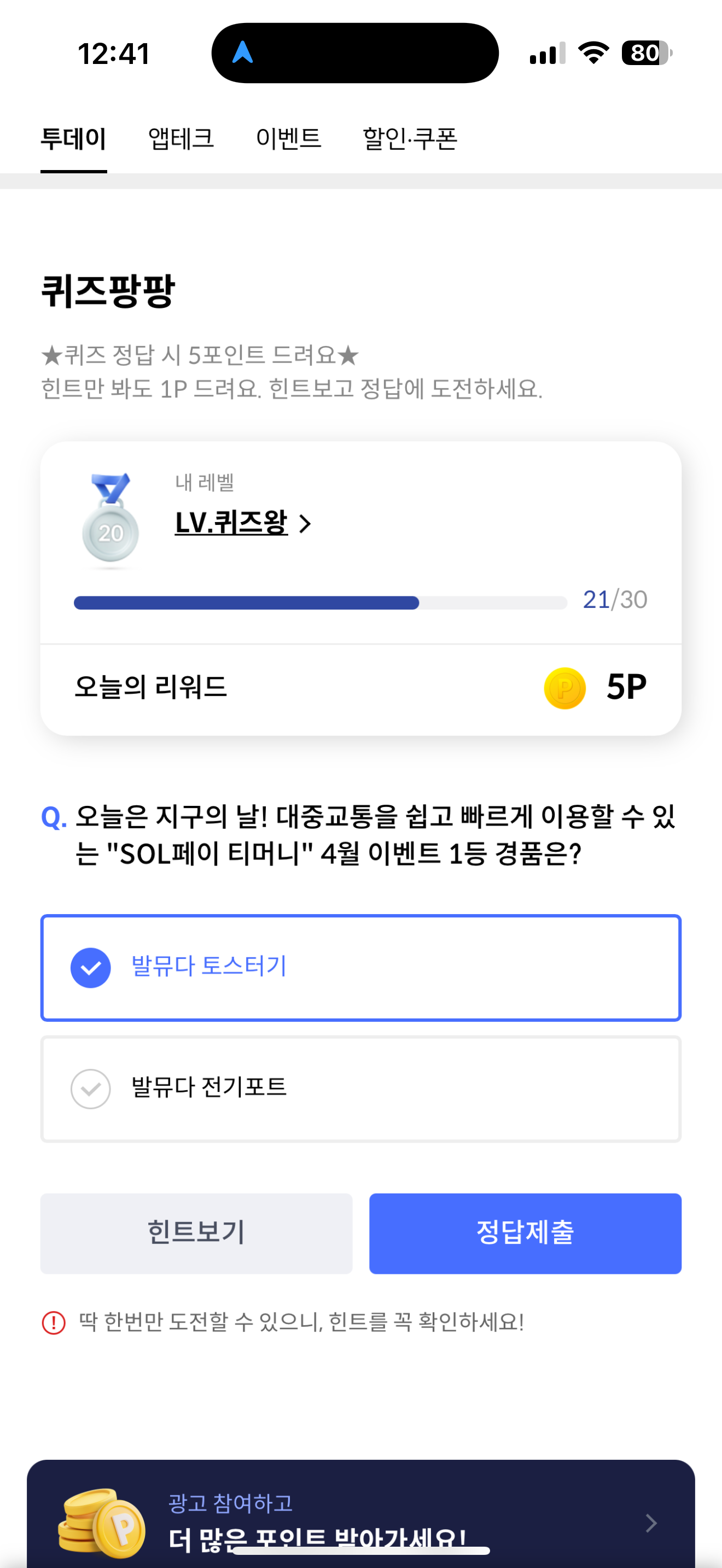 오늘은 지구의 날! 대중교통을 쉽고 빠르게 이용할 수 있는 "SOL페이 티머니" 4월 이벤트 1등 경품은? 보기는 1. 발뮤다 토스터기 2. 발뮤다 전기포트 입니다. 지구의 날입니다. 자동차나 에너지 소비를 줄이기 위한 모두의 노력이 필요한 날입니다.