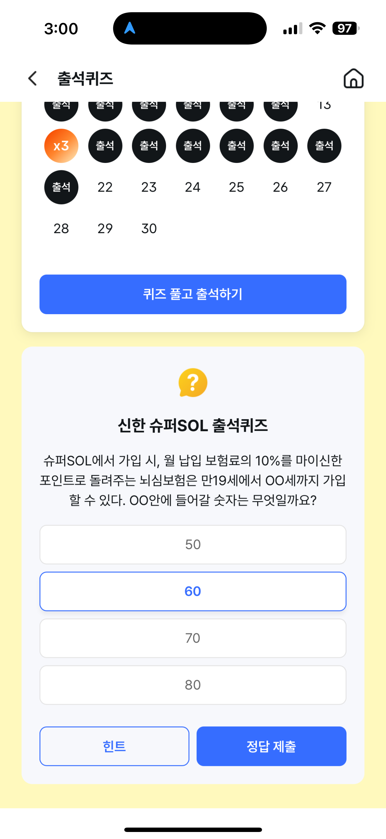 신한 슈퍼SOL 춣석퀴즈 정답은 60 입니다