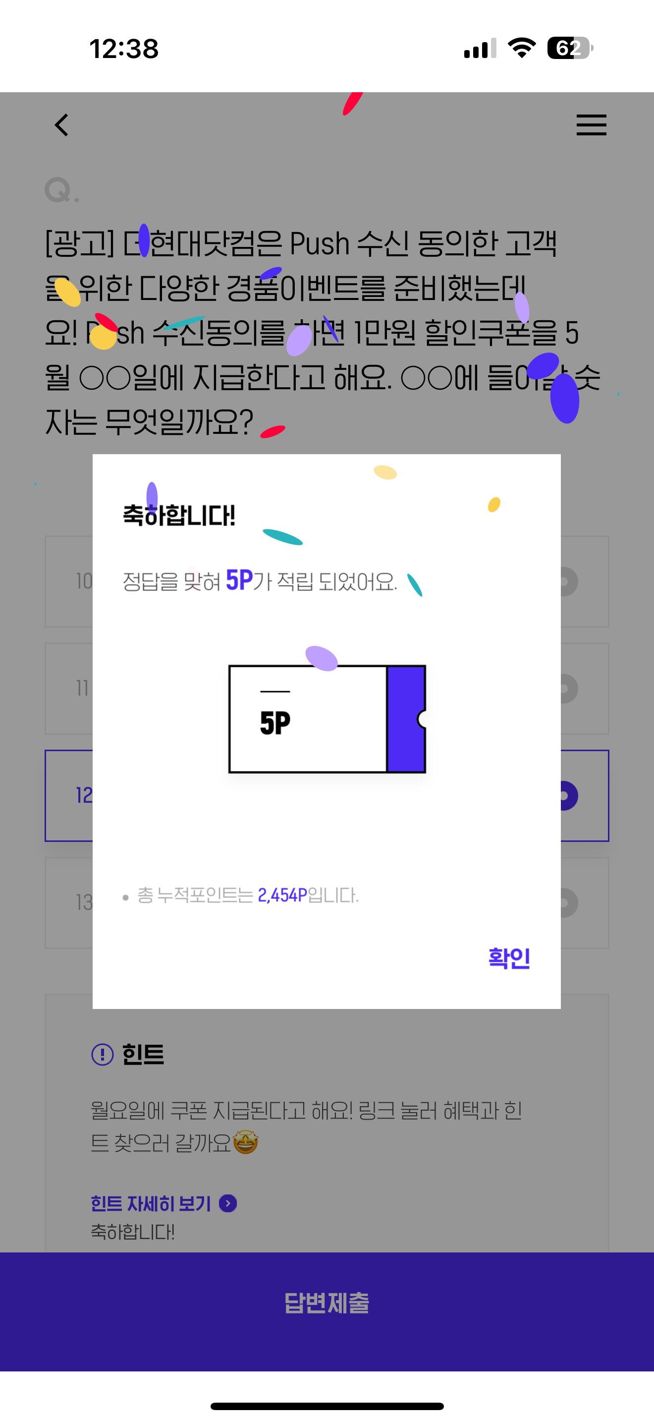 더현대닷컴은 Push 수신 동의한 고객을 위한 다양한 경품이벤트를 준비했는데요! Push 수신동의를 하면 1만원 할인쿠폰을 5월 OO일에 지급한다고 해요. OO에 들어갈 숫자는 무엇일까요? 보기는 1. 10 2. 11 3. 12. 4. 13 입니다. H포인트 퀴즈 정답은 12 입니다