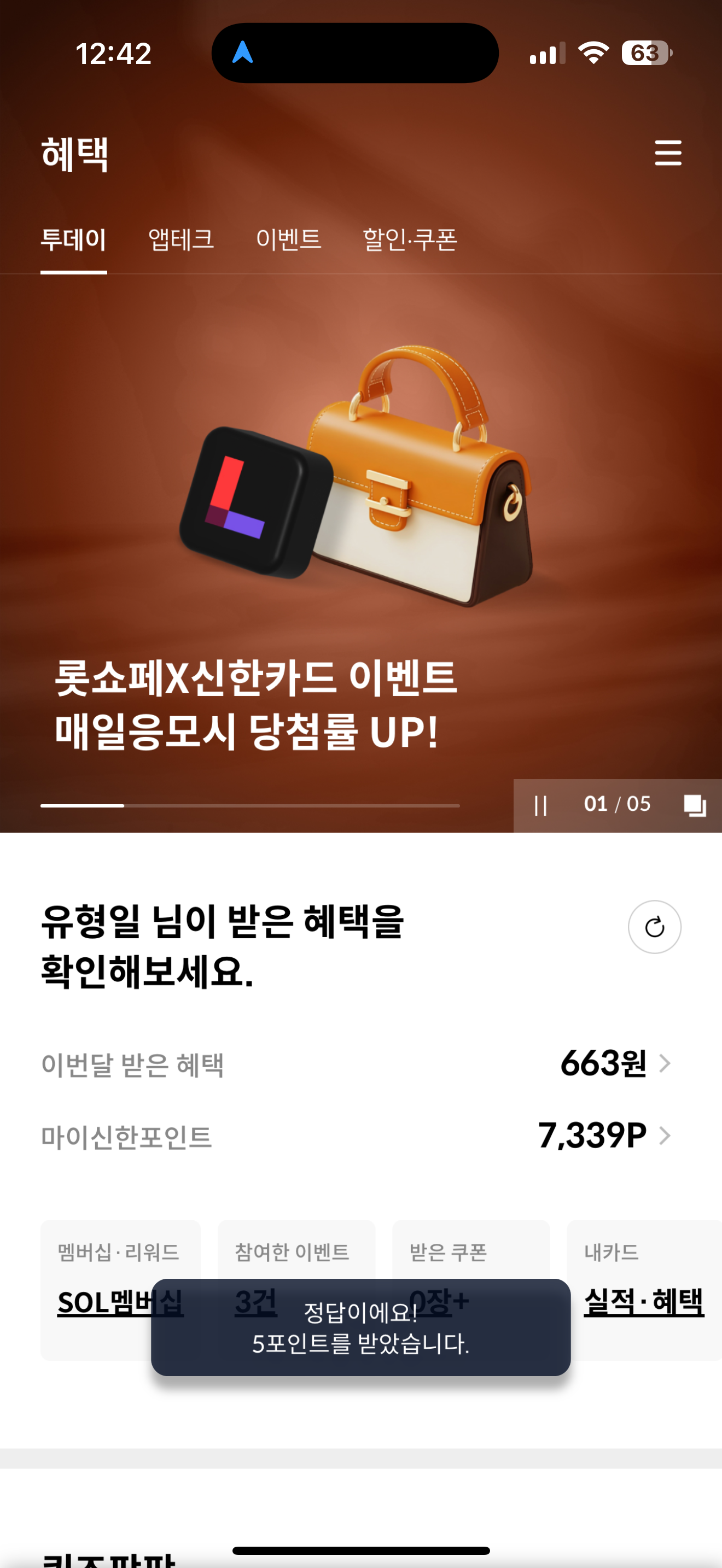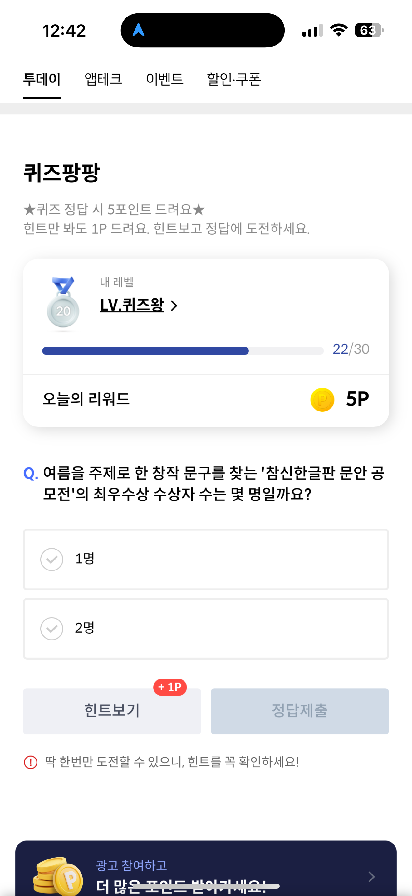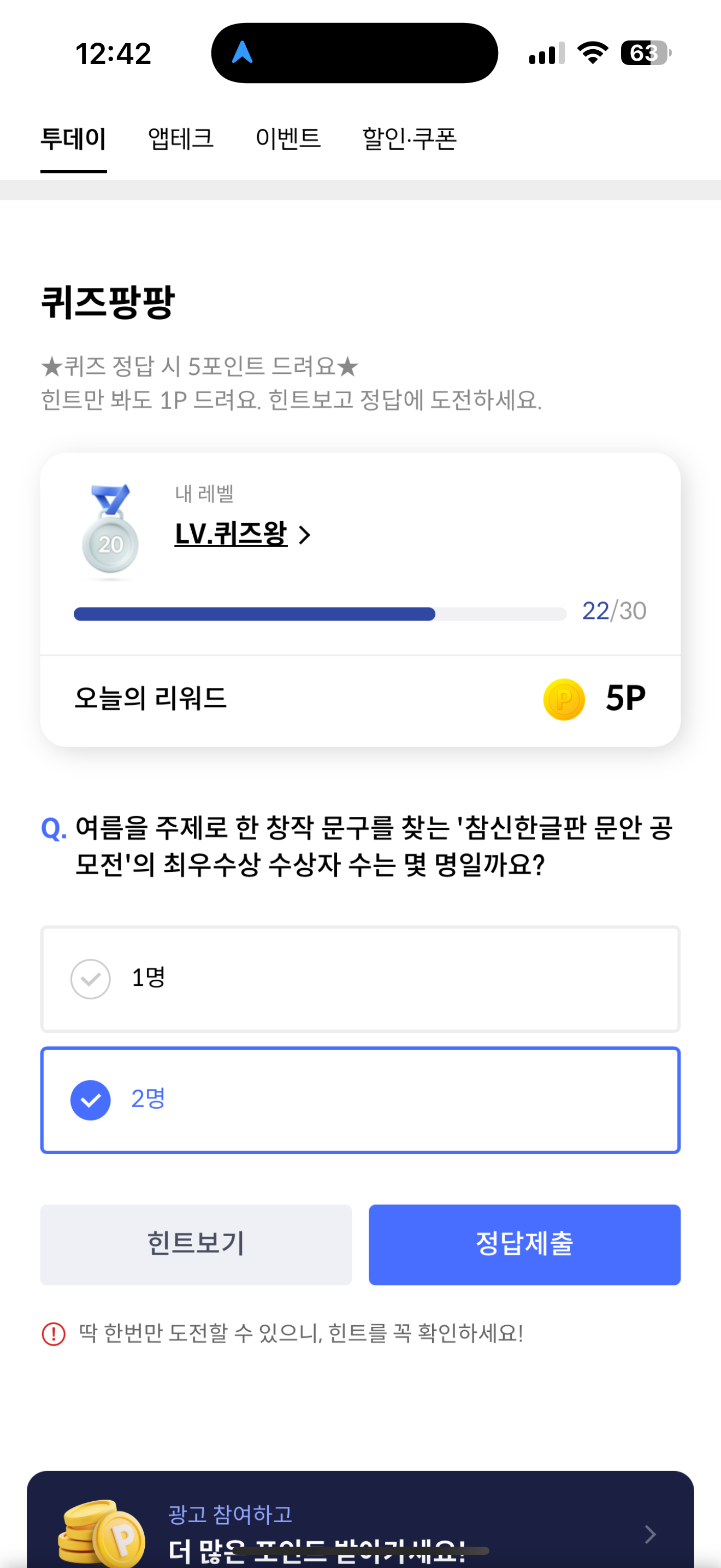 신한카드 퀴즈팡팡 정답은 2명 입니다