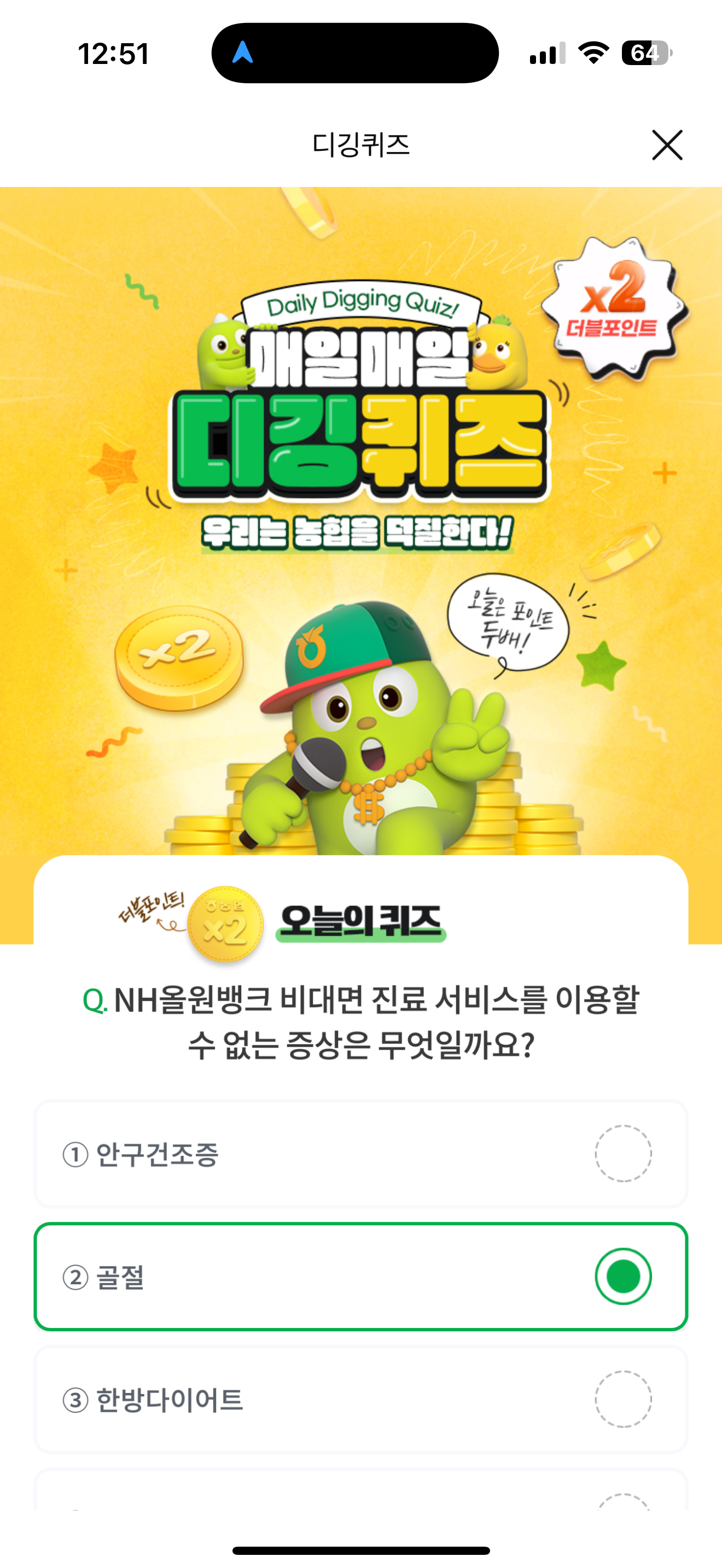 NH올원뱅크 디깅퀴즈 정답은 골절 입니다