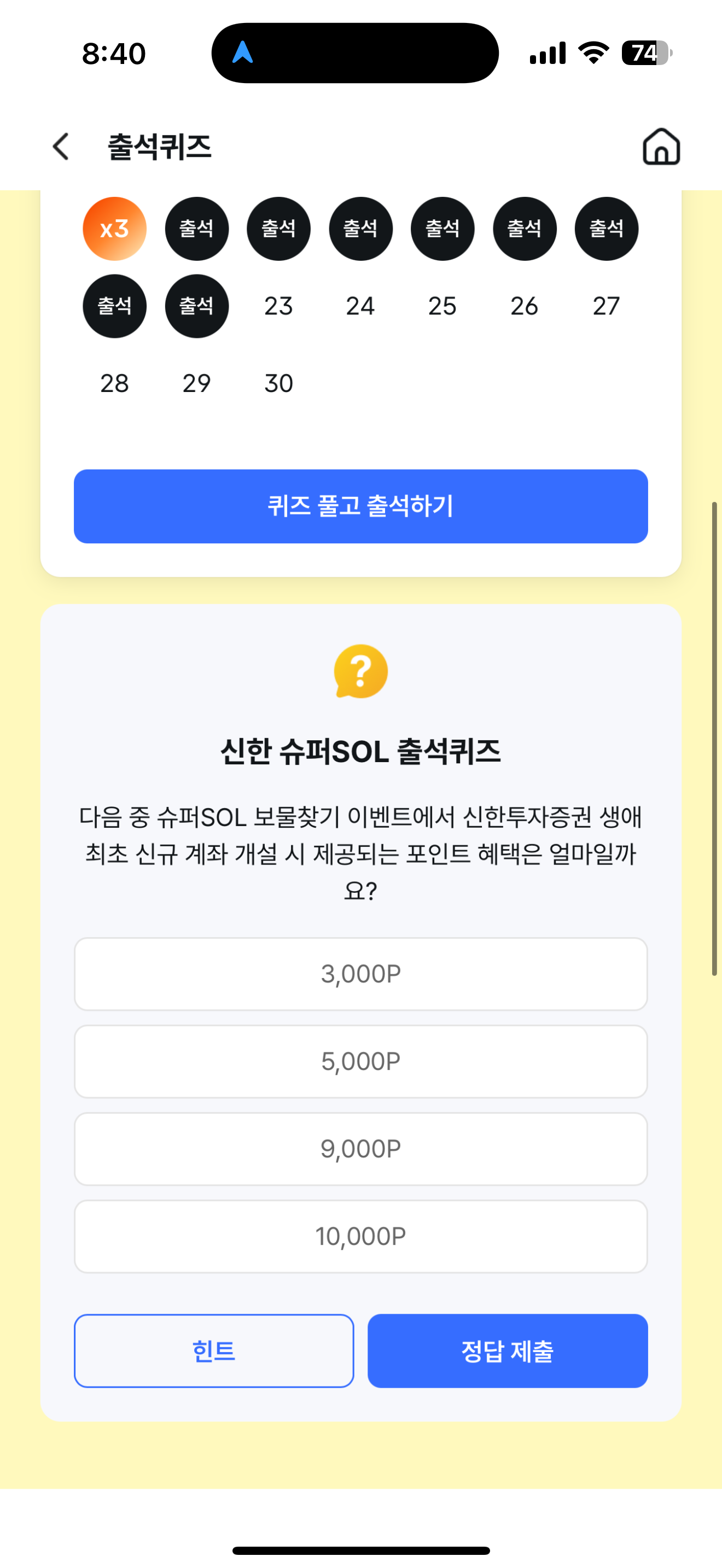 신한 슈퍼SOL 출석퀴즈 정답은 10,000P 입니다