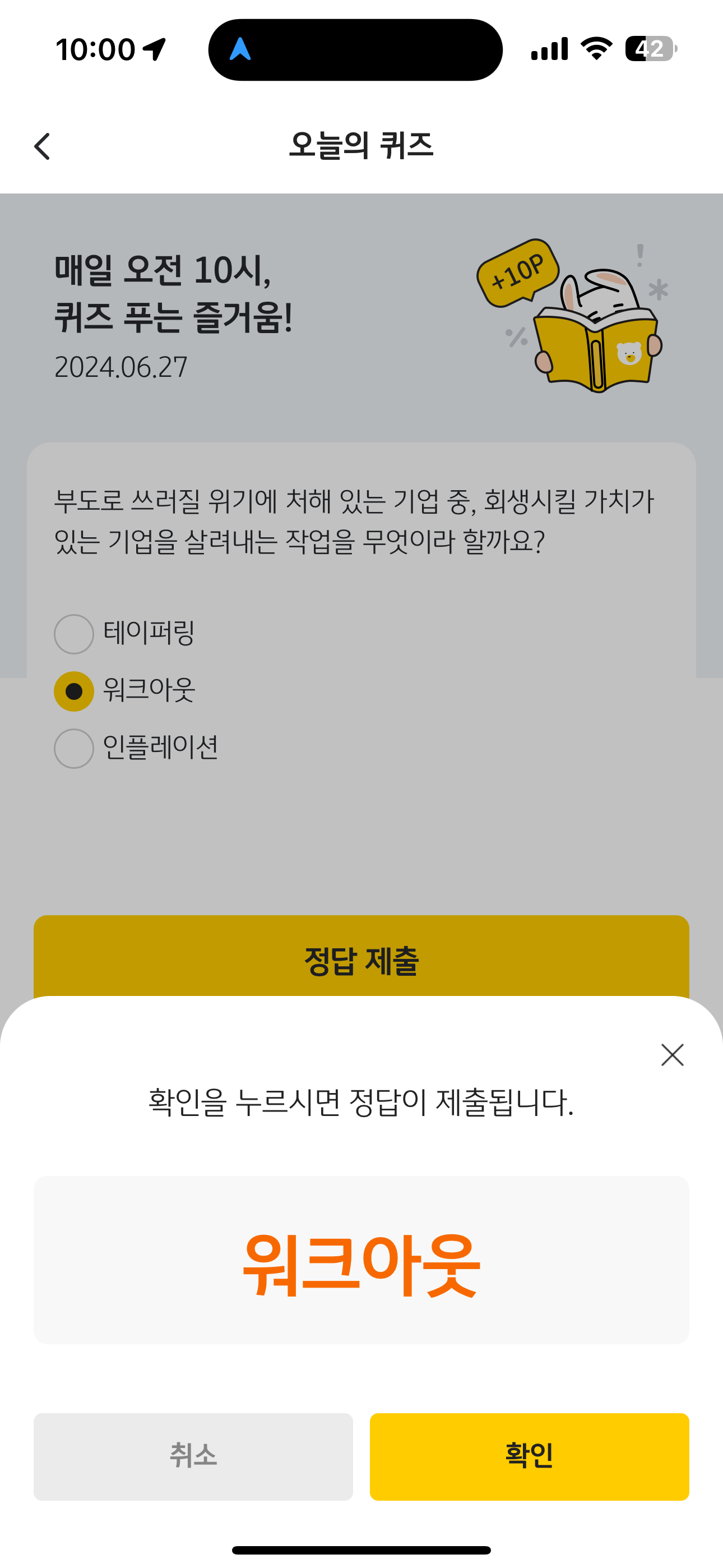 KB Pay 오늘의 퀴즈 6월 27일 정답(부도로 쓰러질 위기에 처해 있는 기업 중, 회생시킬 가치가 있는 기업을 살려내는 작업을 무엇이라 할까요?)