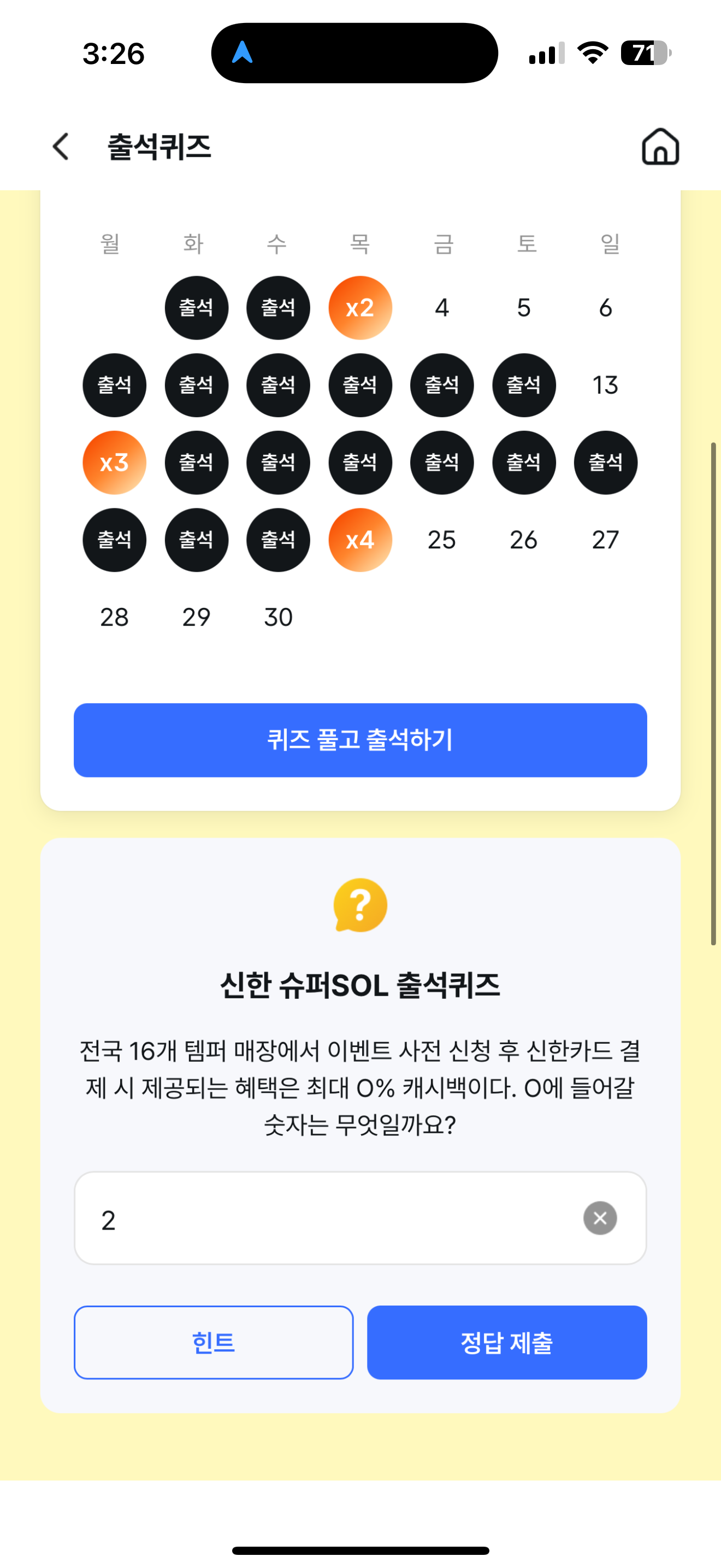 신한 슈퍼SOL 출석퀴즈 정답은 2 입니다