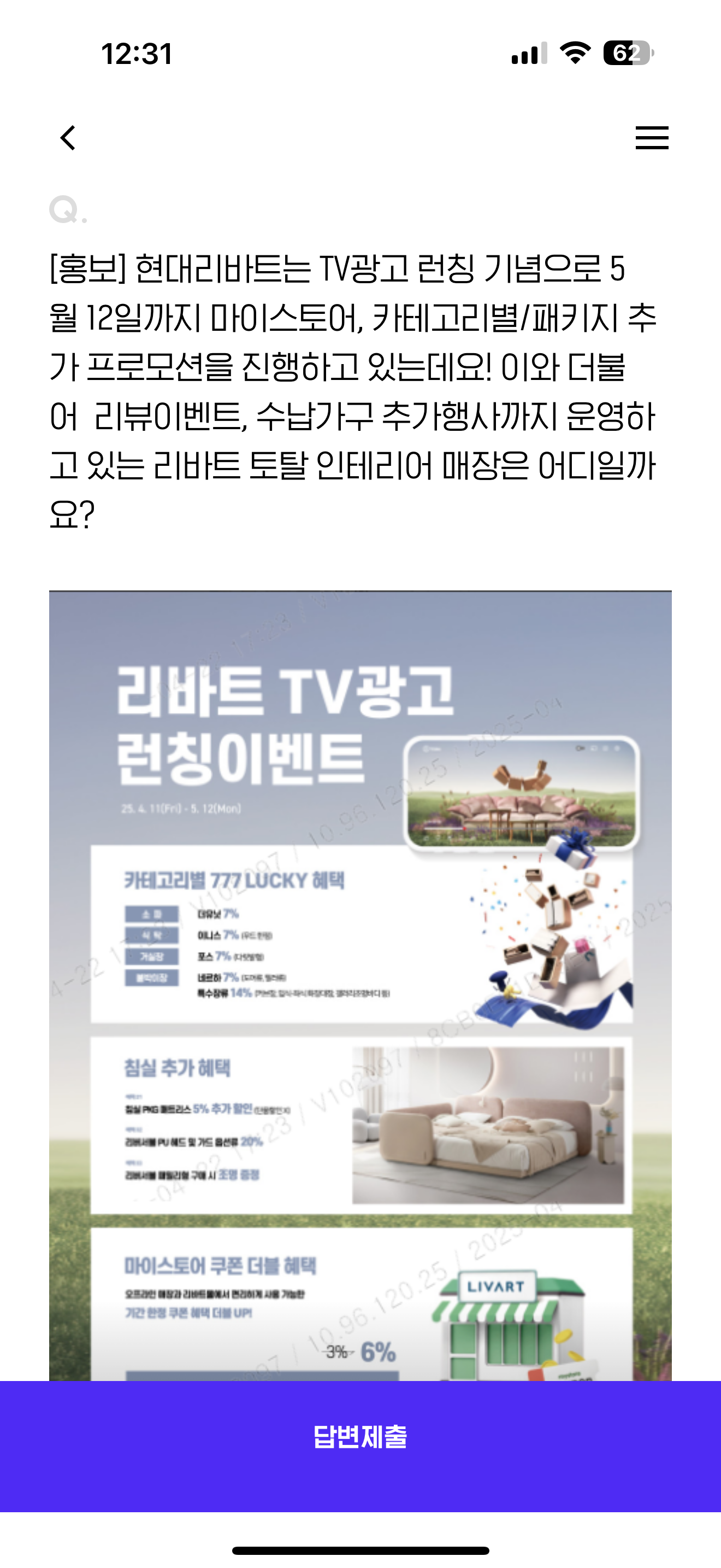 현대리바트는 TV광고 런칭 기념으로 5월 12일까지 마이스토어, 카테고리별/패키지 추가 프로모션을 진행하고 있는데요! 이와 더불어 리뷰이벤트, 수납가구 추가행사까지 운영하고 있는 리바트 토탈 인테리어 매장은 어디일까요? 보기는 1. 현대프리미엄아울렛 김포점 2. 현대백화점 판교점 3. 더현대 서울 4. 현대백화점 신촌점