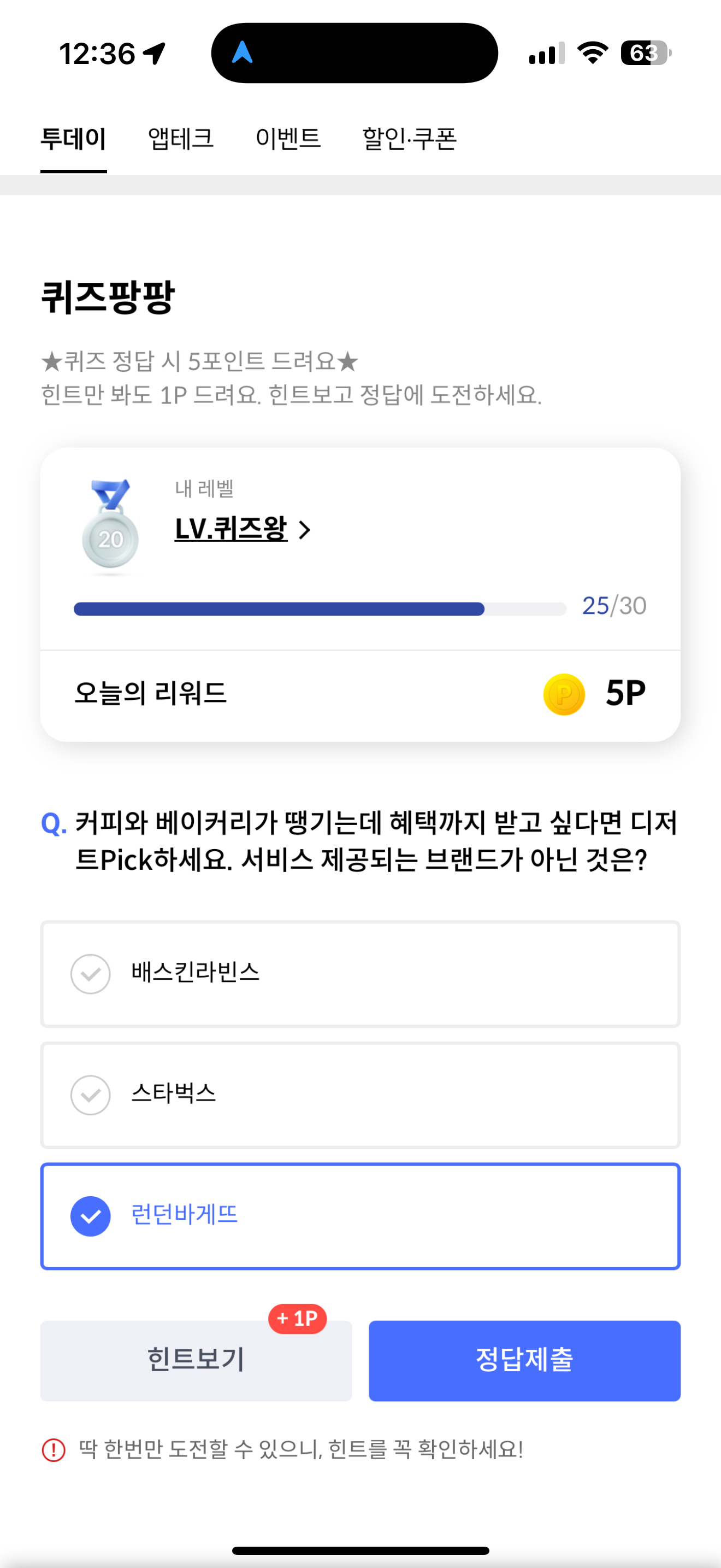 커피와 베이커리가 땡기는데 혜택까지 받고 싶다면 디저트Pick하세요. 서비스 제공되는 브랜드가 아닌 것은? 보기는 1. 배스킨라빈스 2. 스타벅스 3. 런던바게뜨 입니다. 커피와 베이커리 디저트 PIck은 어떤 브랜드가 있을까요? 참고해 보세요
